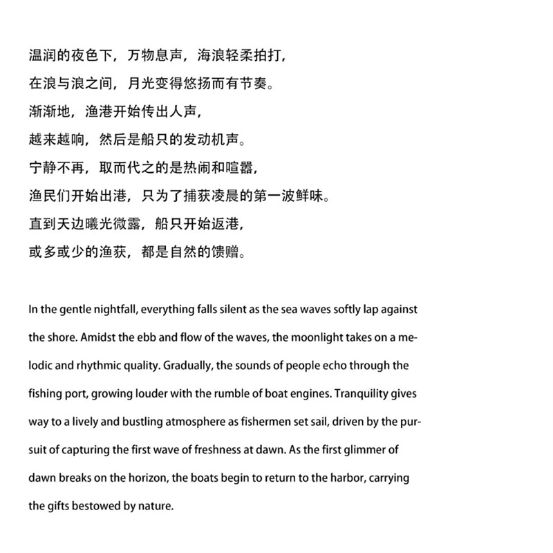 穿过入口,视野变得明亮清晰,墙壁和天花的纹理也越来越明显。餐厅出现在眼前,这是一个被自然光贯穿的空间,如同出海的渔民在太阳升起时分开始准备返航,食客们在到达这里时,也可以落座休息准备品尝美味。