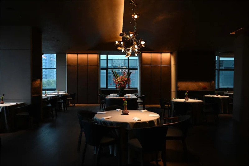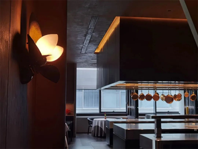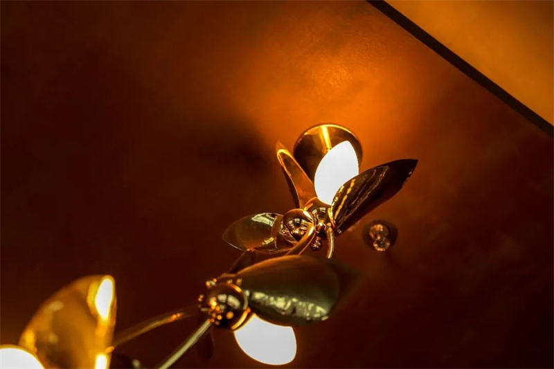 低调哑光的暗色质感衬托了艺术作品奢华的金属质感,而枝形吊灯的每一片“树叶”又在反映着西慕艺术水泥的细密纹理。