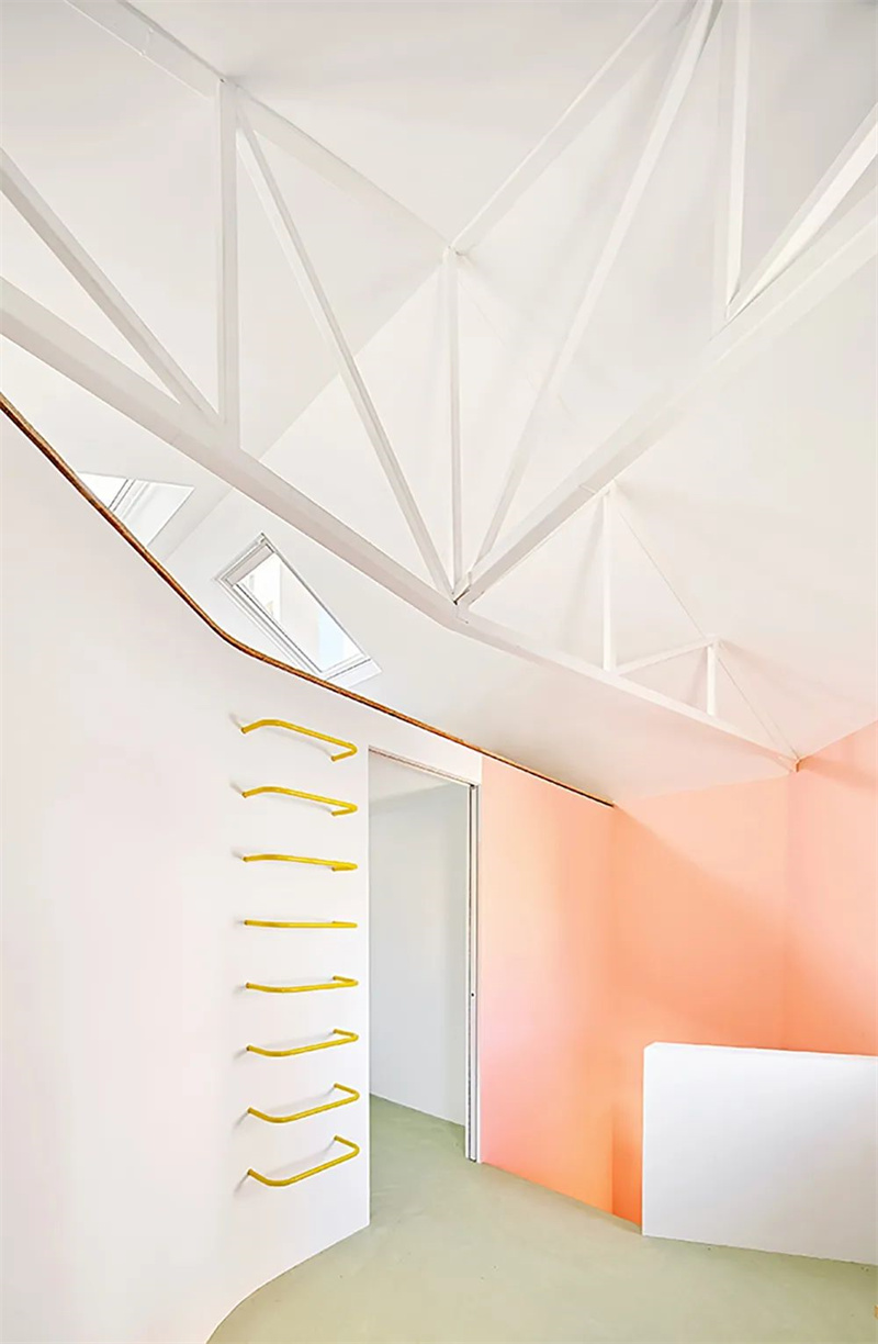 空间的改造引入了新的几何元素,并融入了曲线;在一层,隔墙被全部拆除,以形成一个完整的起居空间,而外露的钢柱则成为该区域中心的亮点。在二层,三面坡屋顶的支撑结构装点着整个空间。除此之外,曲线的隔墙和天花造型将卧室和工作室空间加以分隔。