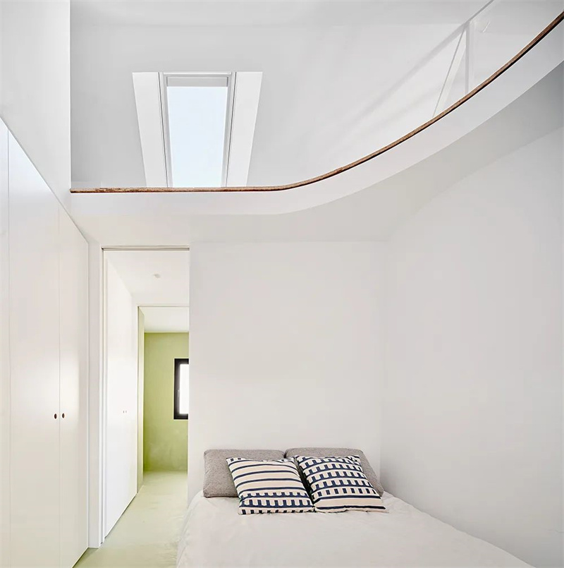 每层空间都选用了独特的配色。为了实现这一设想,西班牙设计团队 Espacio Papel Arquitectos 引入了 Cement Design 材料,将其应用于室内各个角落,为整个室内增添了活力和个性,呈现出独特的质感和外观。同时,Cement Design的运用不仅在视觉上为空间带来独特的魅力,也在耐用性和实用性方面提供出色的性能,与年轻夫妇的生活方式完美契合