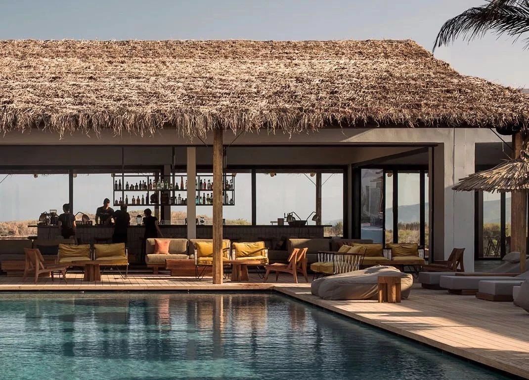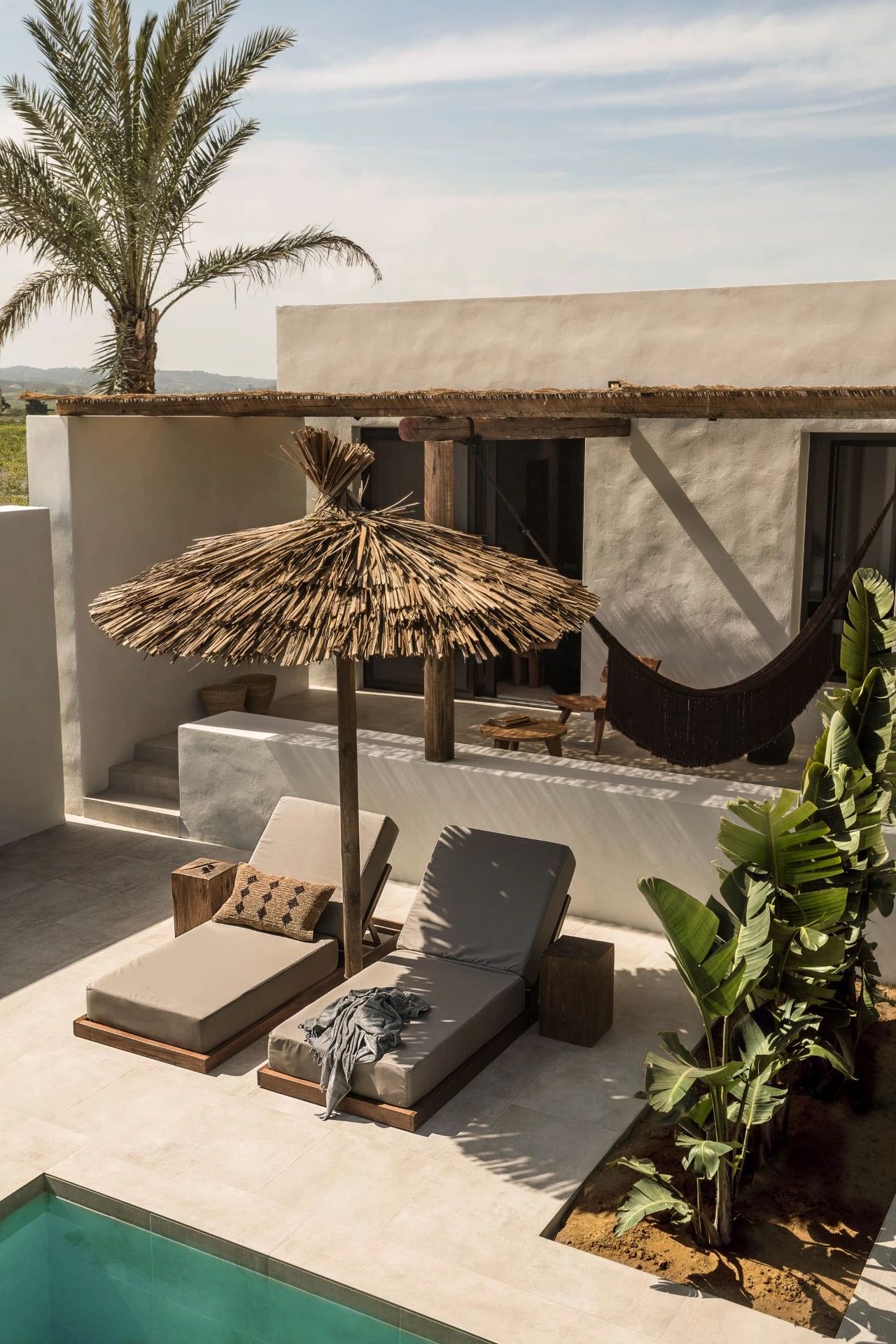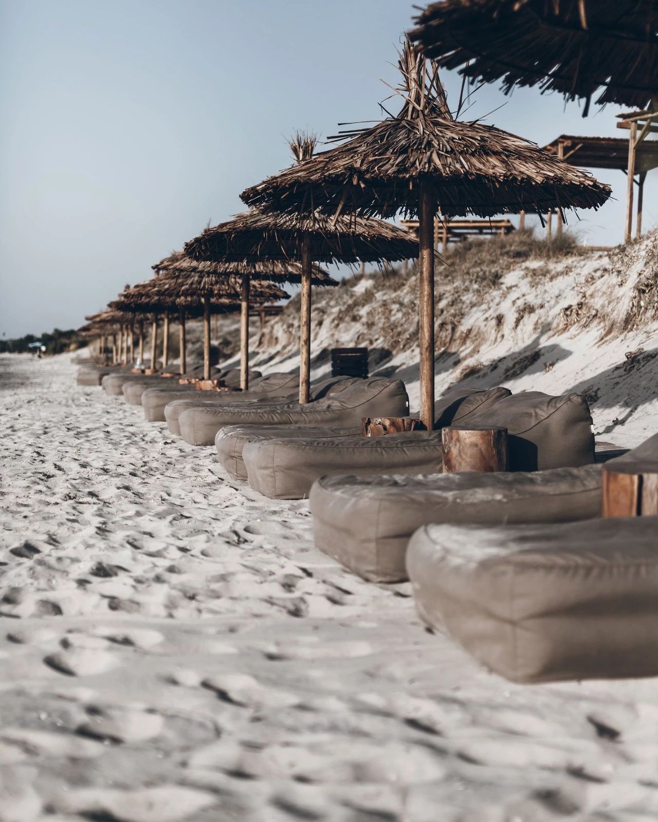 茅草屋顶和广阔的空间与风吹过的海滩和蓝色海洋相呼应。热带的中世纪风格,明亮的阳光明媚的早晨流入慵懒和放纵的下午。