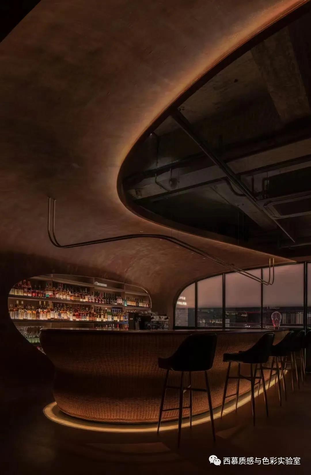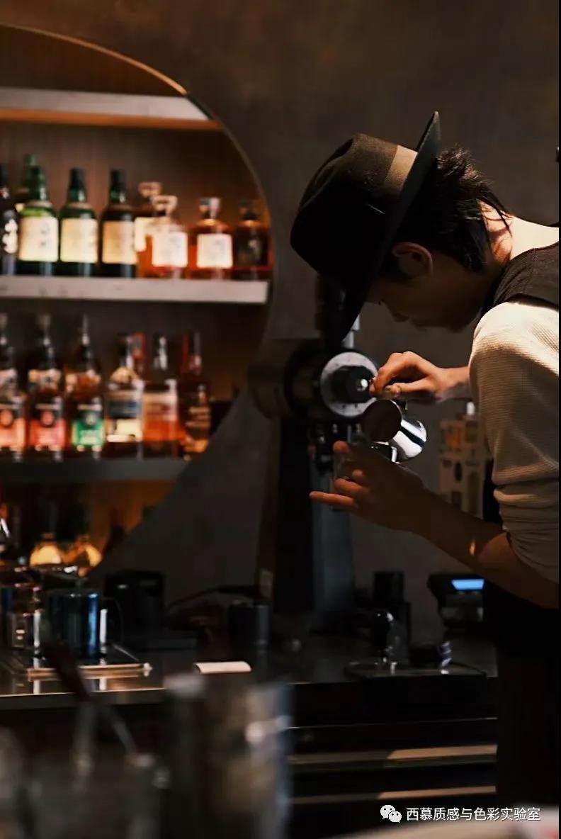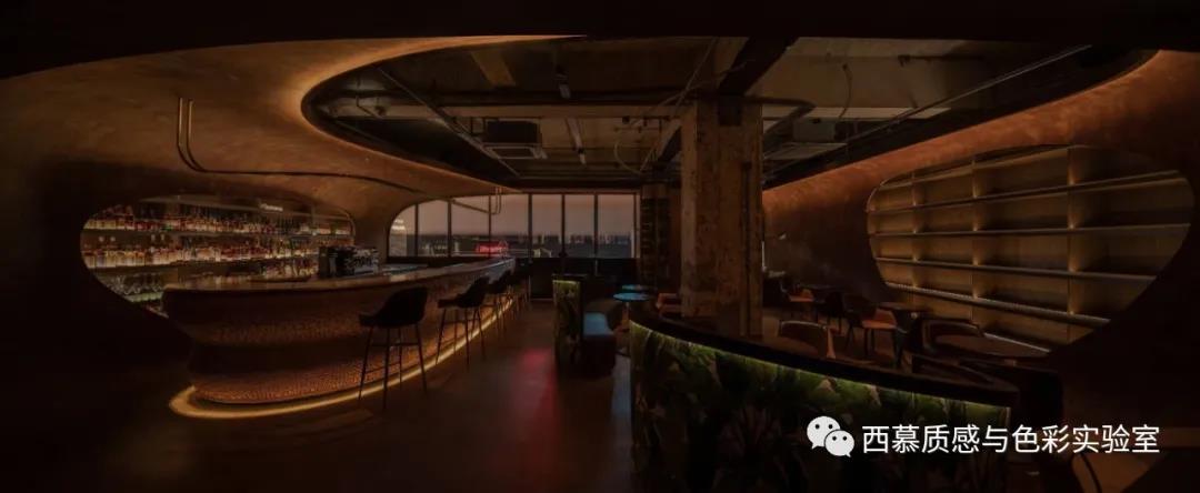 萃坊·CAFE G1广泛应用西慕艺术水泥铁锈墙地一体效果, 营造出了一种时尚与艺术相交织的氛围,铁锈水泥传递斑驳沧桑的美感,与工业风设计完美搭配,暖金色的灯光,照亮每一个角落,柔和舒适,看着一面墙的威士忌,被沉浸式铁锈商业空间迷住的意识一下就回来了,是看到好酒以后的兴奋。