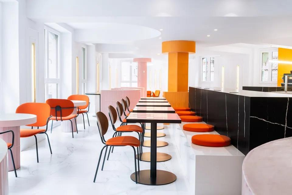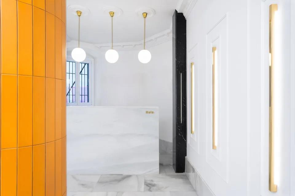 室内空间有着纯粹的几何图形和对比强烈的色彩搭配而成。材料的选择以原始建筑作为参考,同时又运用了黑白色大理石、人字形拼接地板和嵌条装饰、彩色玻璃窗以及黄铜细部辅以装饰,以独具现代感的金属材料、Porcelanosa陶瓷和Complementto的鲜艳瓷砖共同打造而成。
