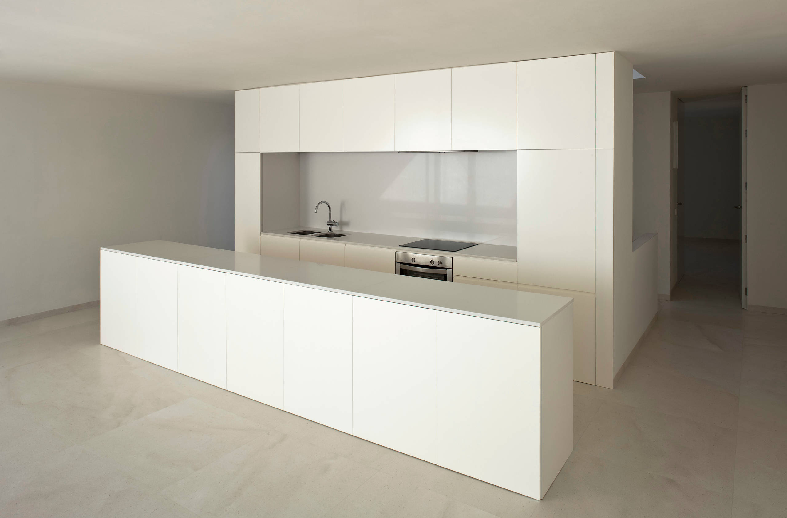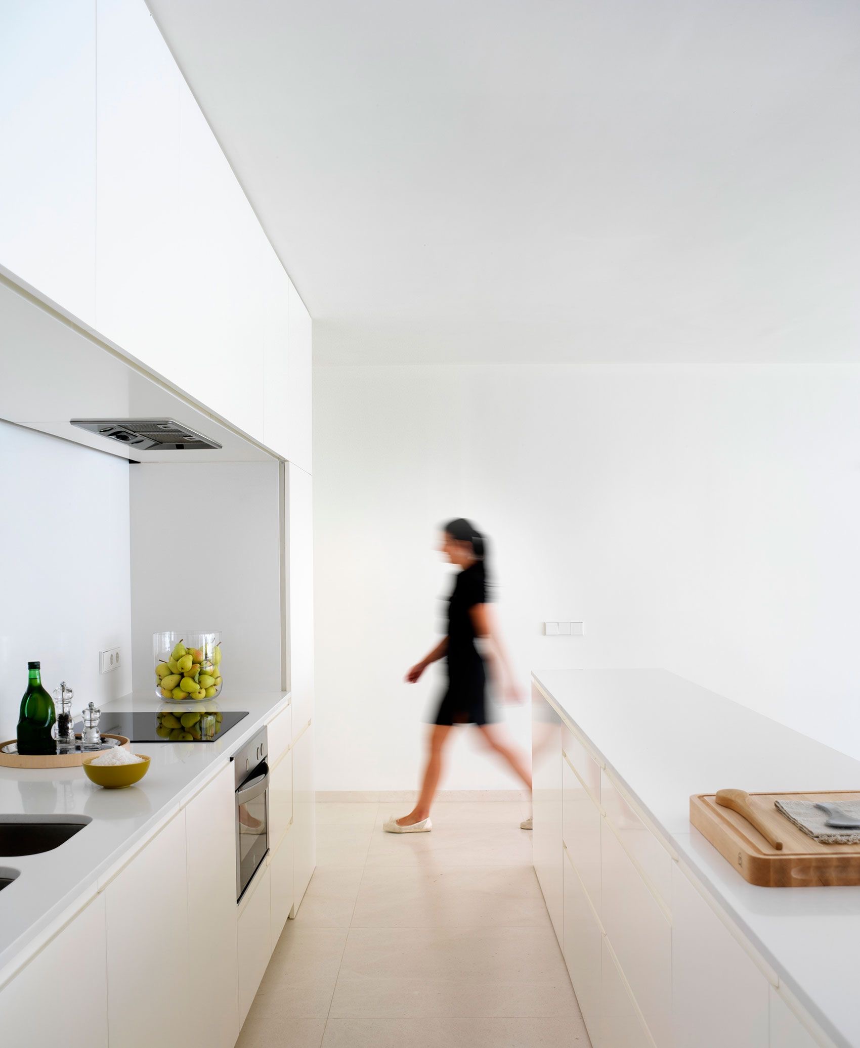 开放式厨房与客厅和餐厅共用这一层。内置家具由白漆 MDF 制成,由 Pedro Segura Landete 细木工制成。厨房的嵌入式家具是平行排列的,工作台面位于壁龛内,包括水槽和烹饪区。