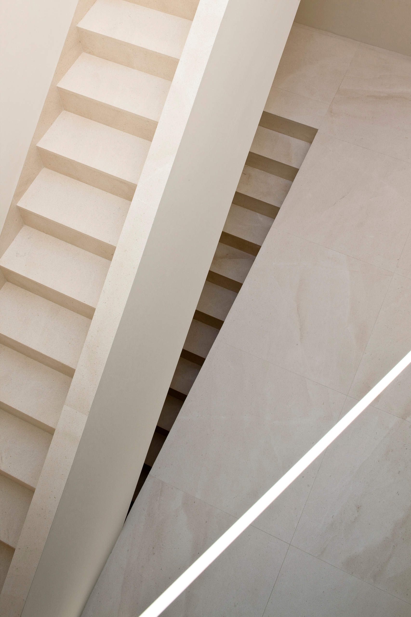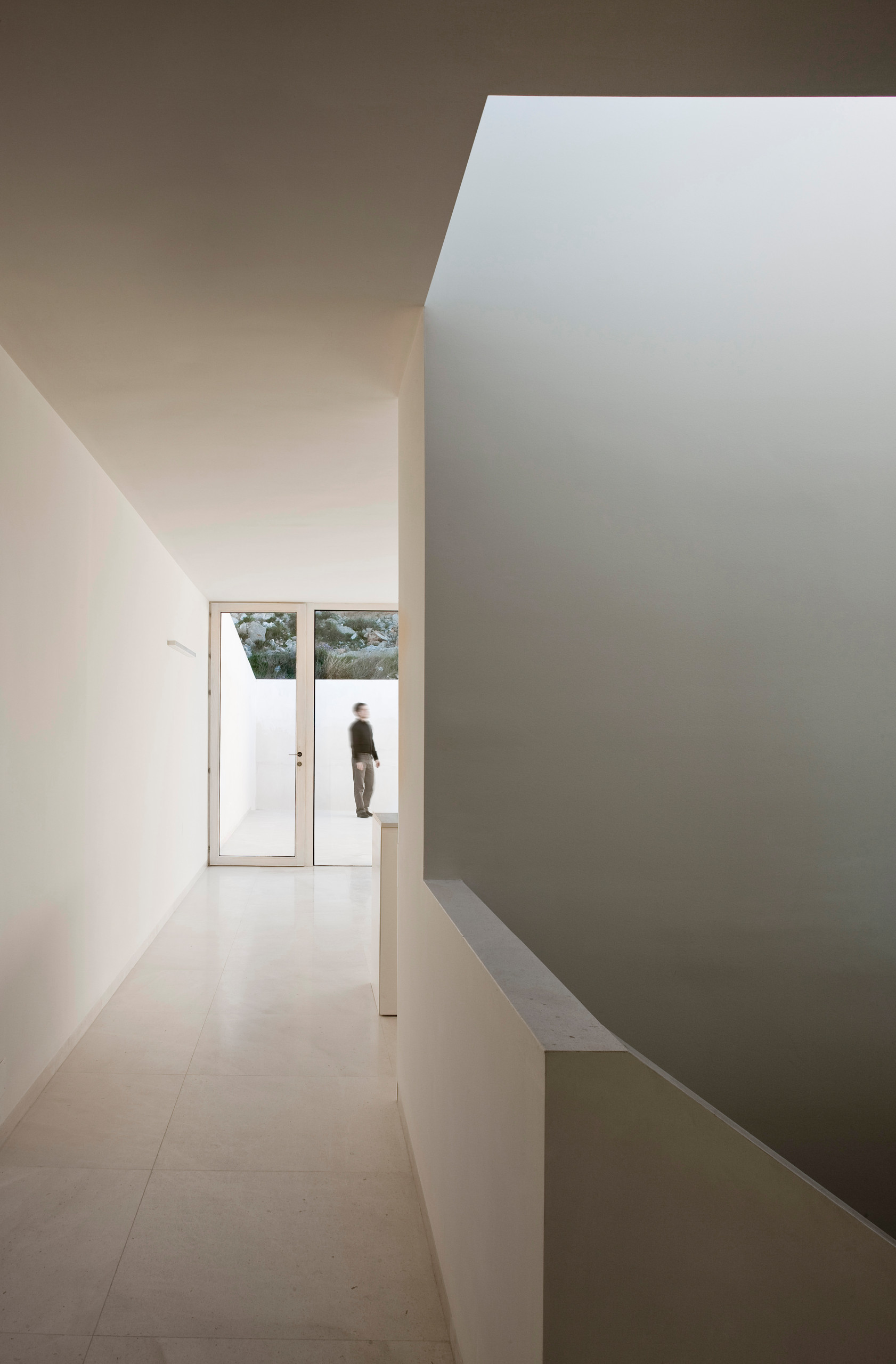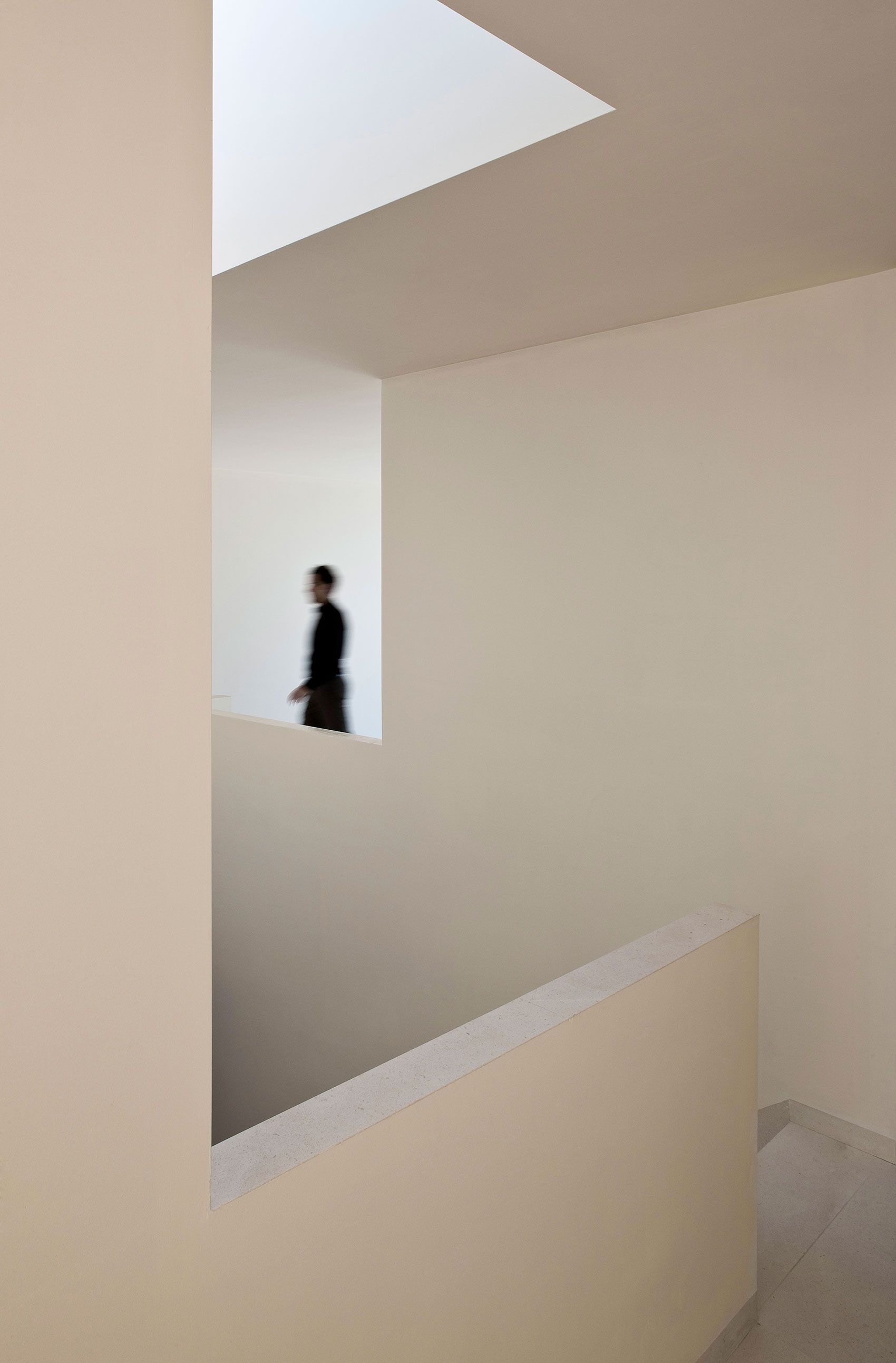在去一楼的路上,你走上一个楼梯,楼梯似乎从墙上折叠出来,被天窗照亮。露台享有屋顶和阿约拉山谷的全景。你可以从上面看到楼梯间的景色。明亮的卡普里石,用于地板和一些墙壁,在浴室中,营造出抽象的美感。