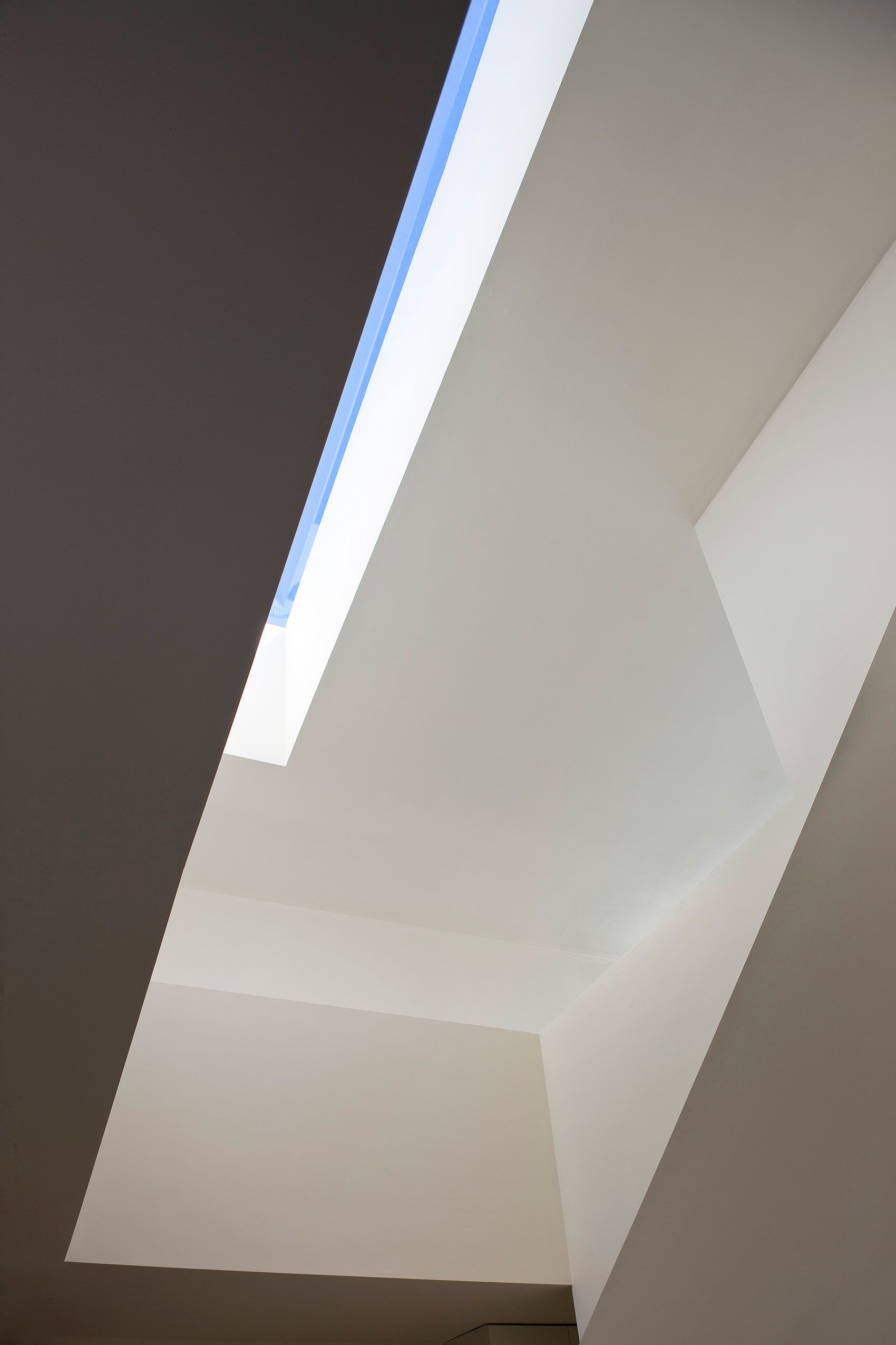 从楼梯间往上看,可以看到天窗,光线通过天窗落入房子的中心区域。这间浴室位于睡眠区,可通过带内置橱柜的走廊进入,不带把手。