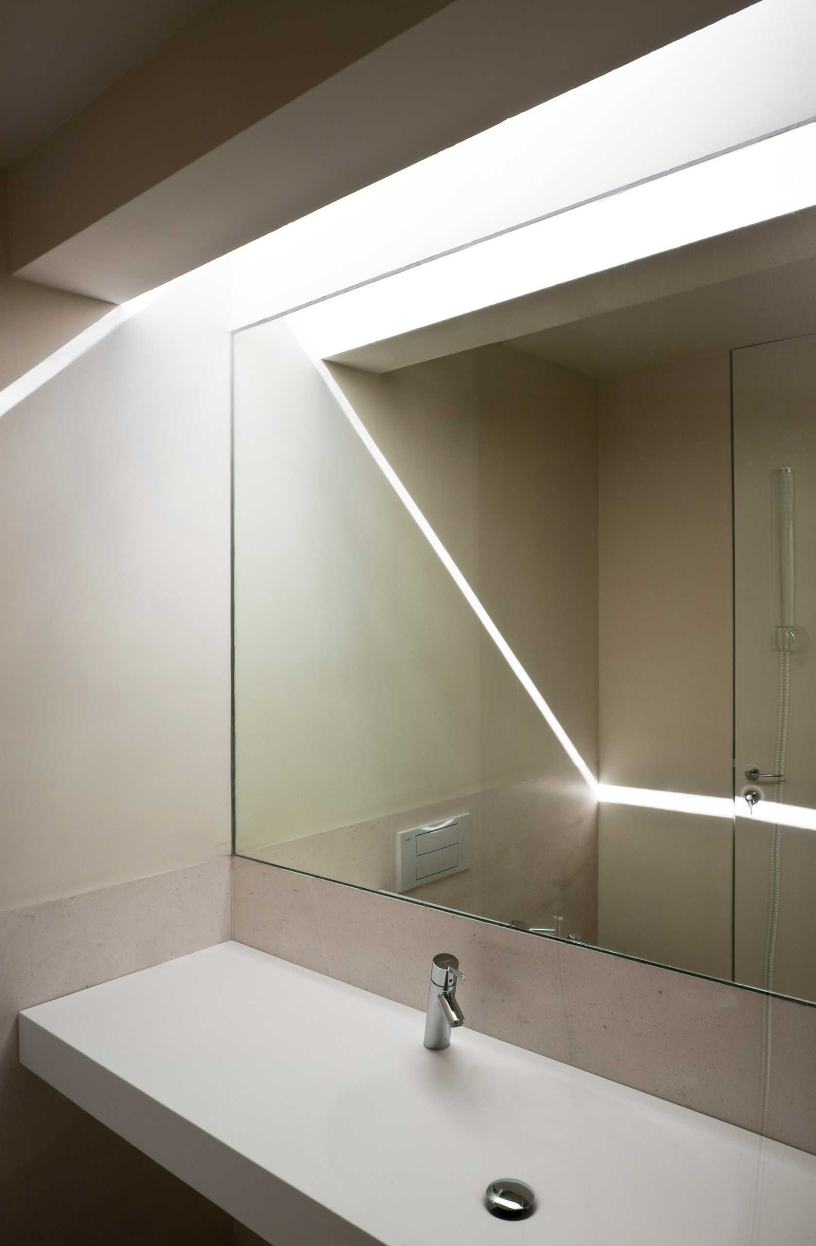在这第二间浴室中,以相同的外观设计,您可以很好地看到自然光的作用。洗脸盆是 Sanico 的 Supercity 型号,配有汉斯格雅的达丽丝 S2 水龙头。人工照明是由 Studio 2 定制的荧光灯创建的。