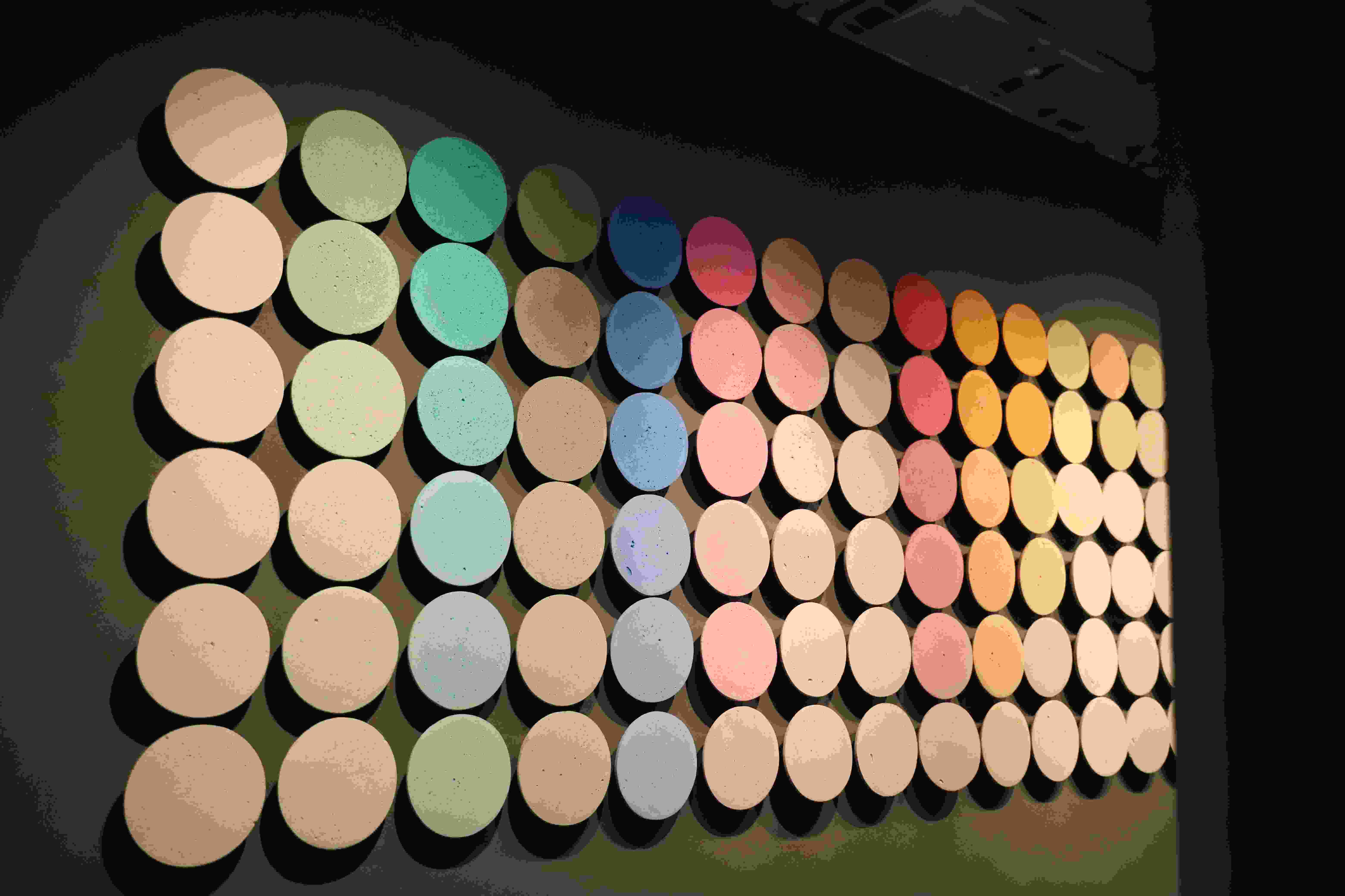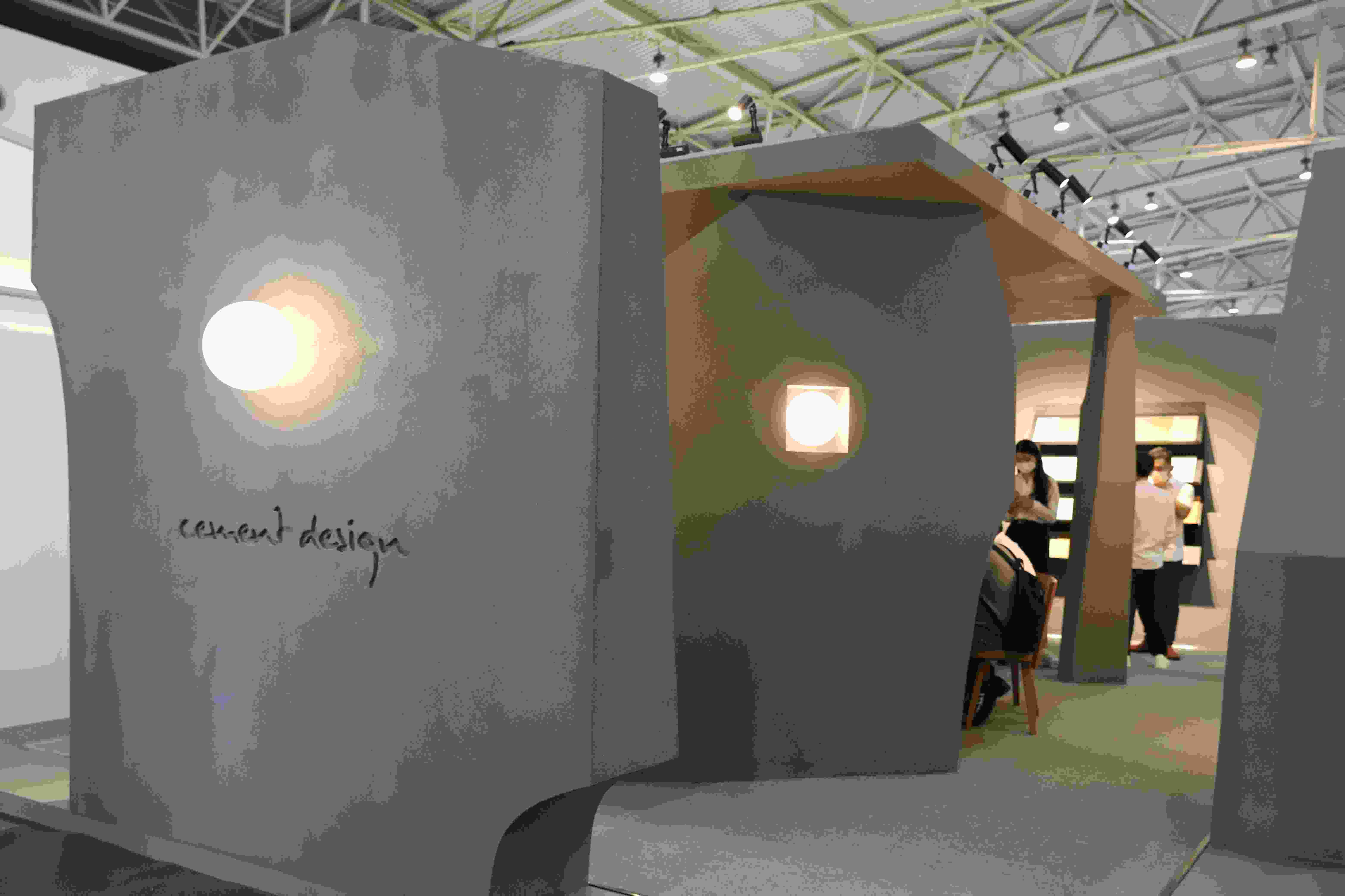 墙、顶、地,甚至洽谈桌皆采用西慕艺术水泥作为饰面材料,整个空间被深灰色的高级质感填充,展厅本身就是一个雕塑品,在展位矩阵中屹立的迷你巨石阵,是一件被展览的材料作品。