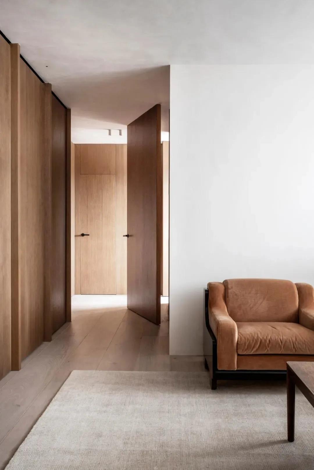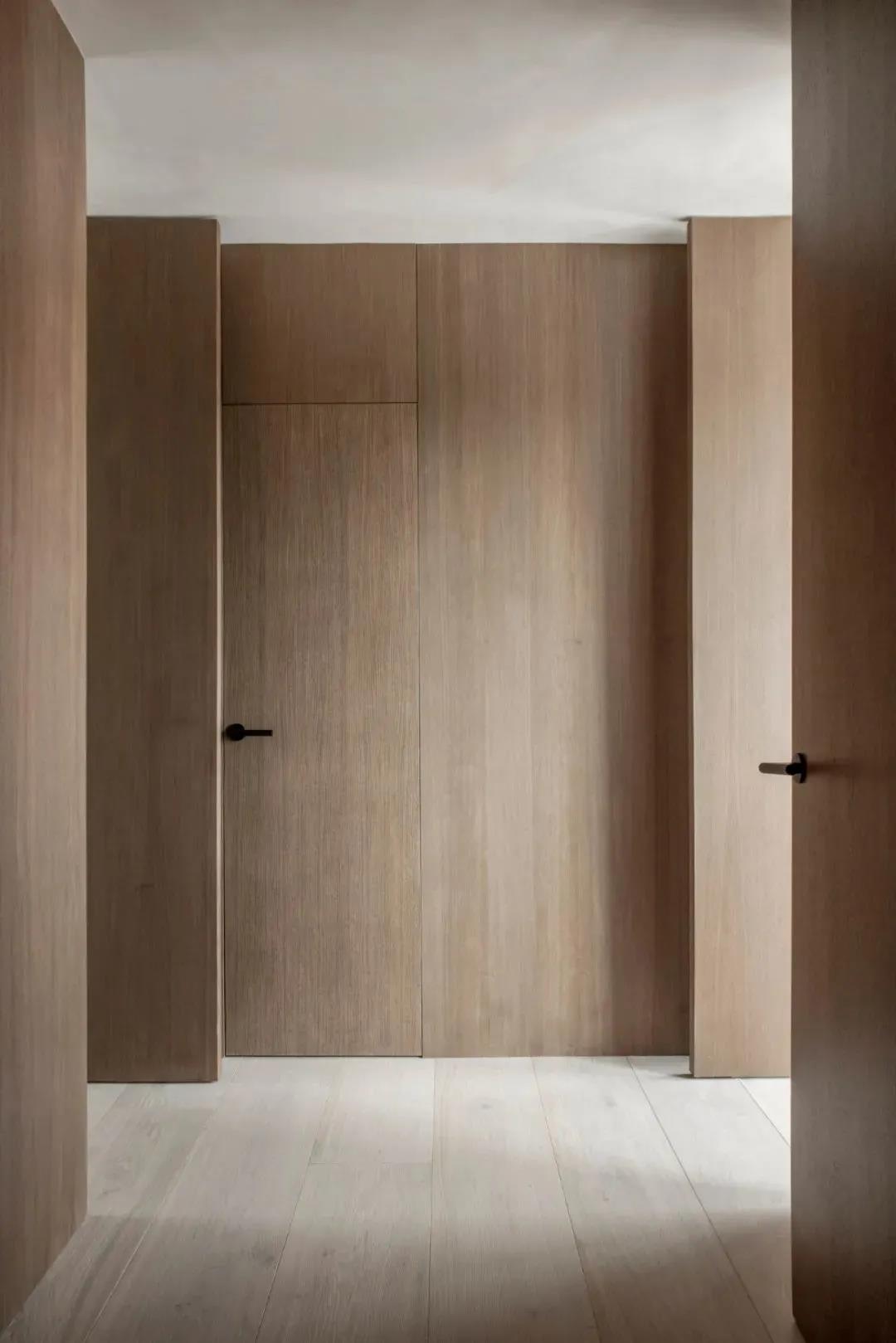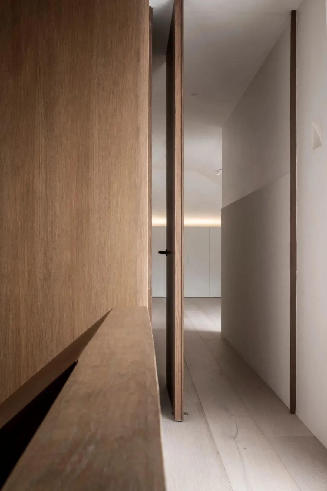 室内的门都采用中轴门的形式,使用起来更加的灵活,同时也具备新奇感。同种木饰面的一致打造,使空间的质感浑然天成,立面的规整性始终能保持和谐感与统一性。