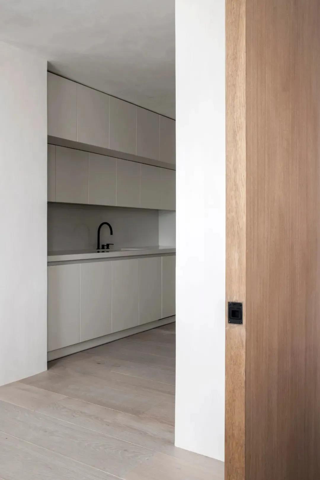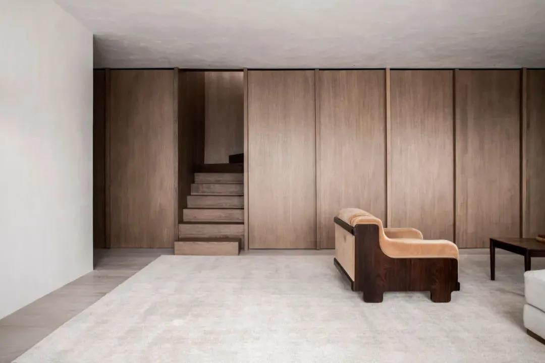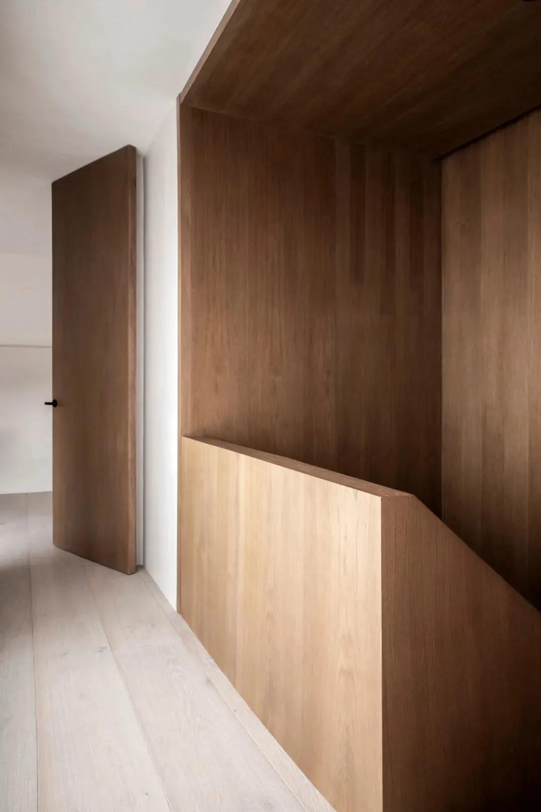 室内的门都采用中轴门的形式,使用起来更加的灵活,同时也具备新奇感。同种木饰面的一致打造,使空间的质感浑然天成,立面的规整性始终能保持和谐感与统一性。