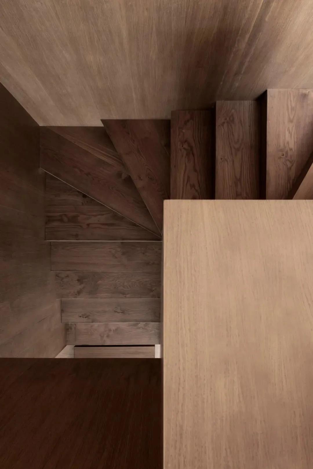 楼梯间用原木整体打造,将醇厚温馨的质感一直延伸到楼上,空间的和谐感沁人心脾,同时也可从家具的选配和空间的细节中窥见生活的品味感。