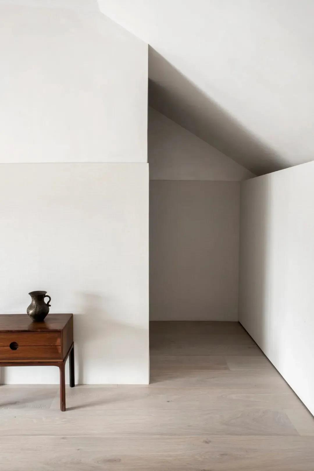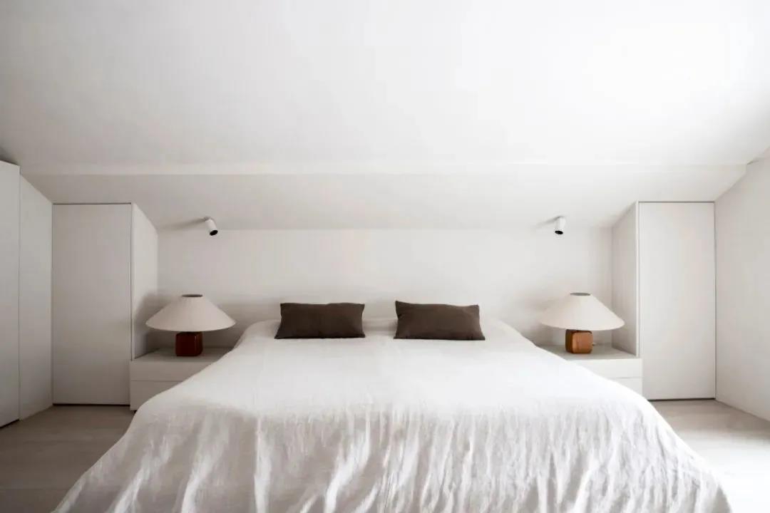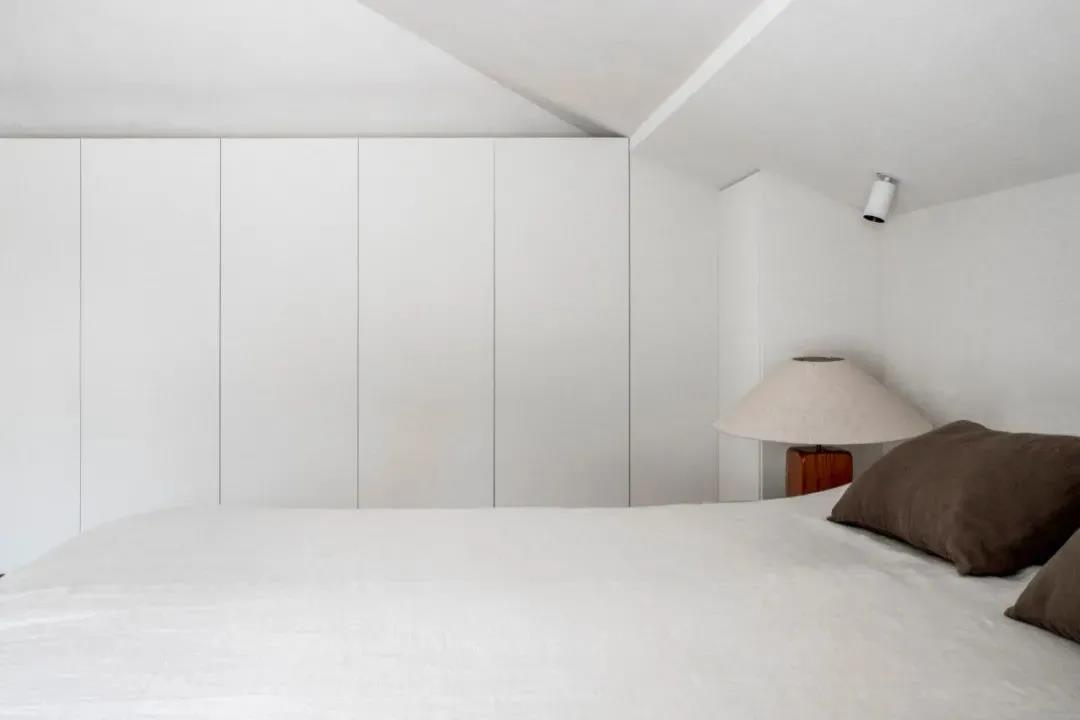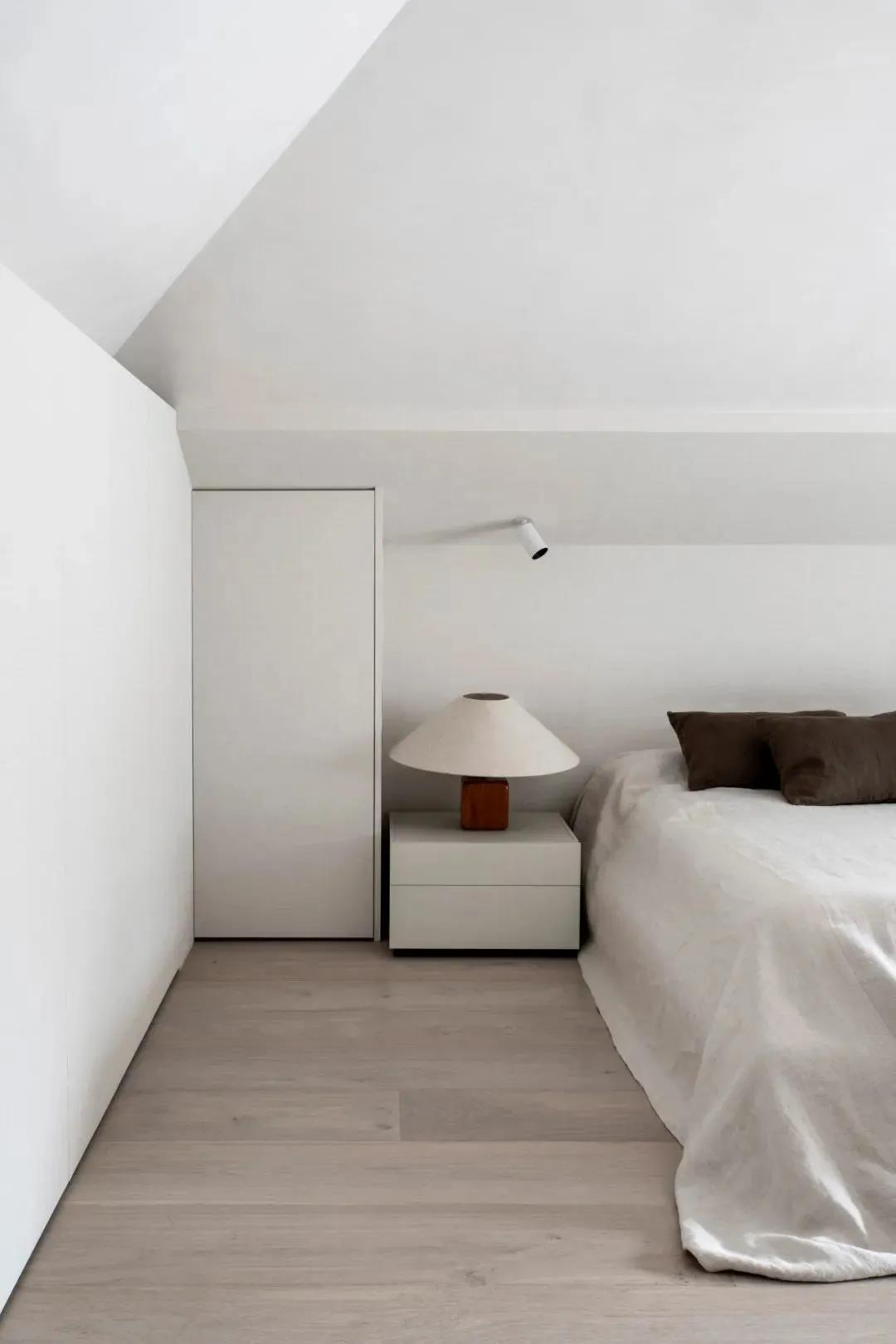 阁楼卧室区域考虑到层高的因素,整体采用白色的基调来打造,显得通透而轻盈,用深色的饰品适量点缀,增添略微沉淀的气度。