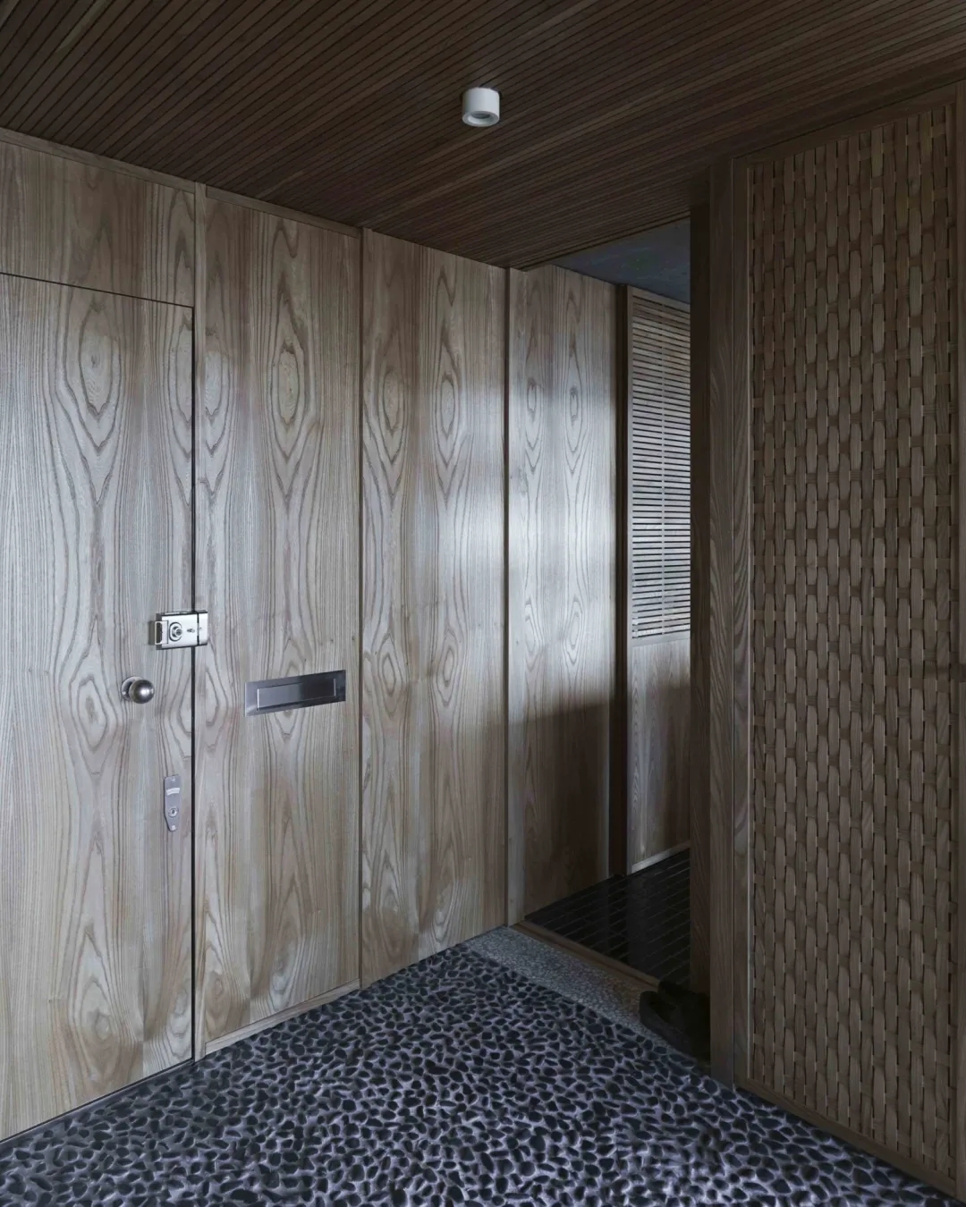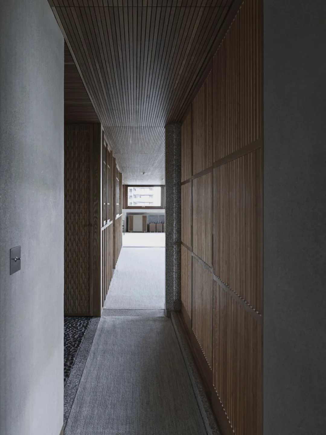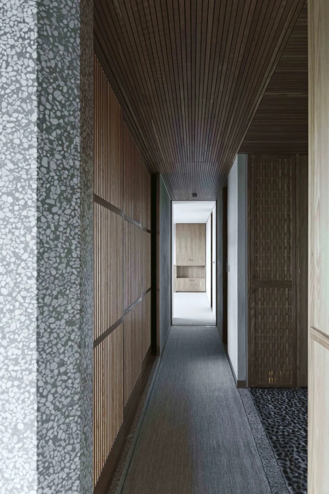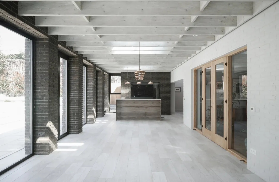 从布局到材料,纯白色的天花板最适合营造空间和光线的感觉,模仿头顶的天空,密集、低矮的板条,精确对齐的单向天花板,木材沿着居住空间的轴线引导视线,营造出意想不到的高度和宽度感。