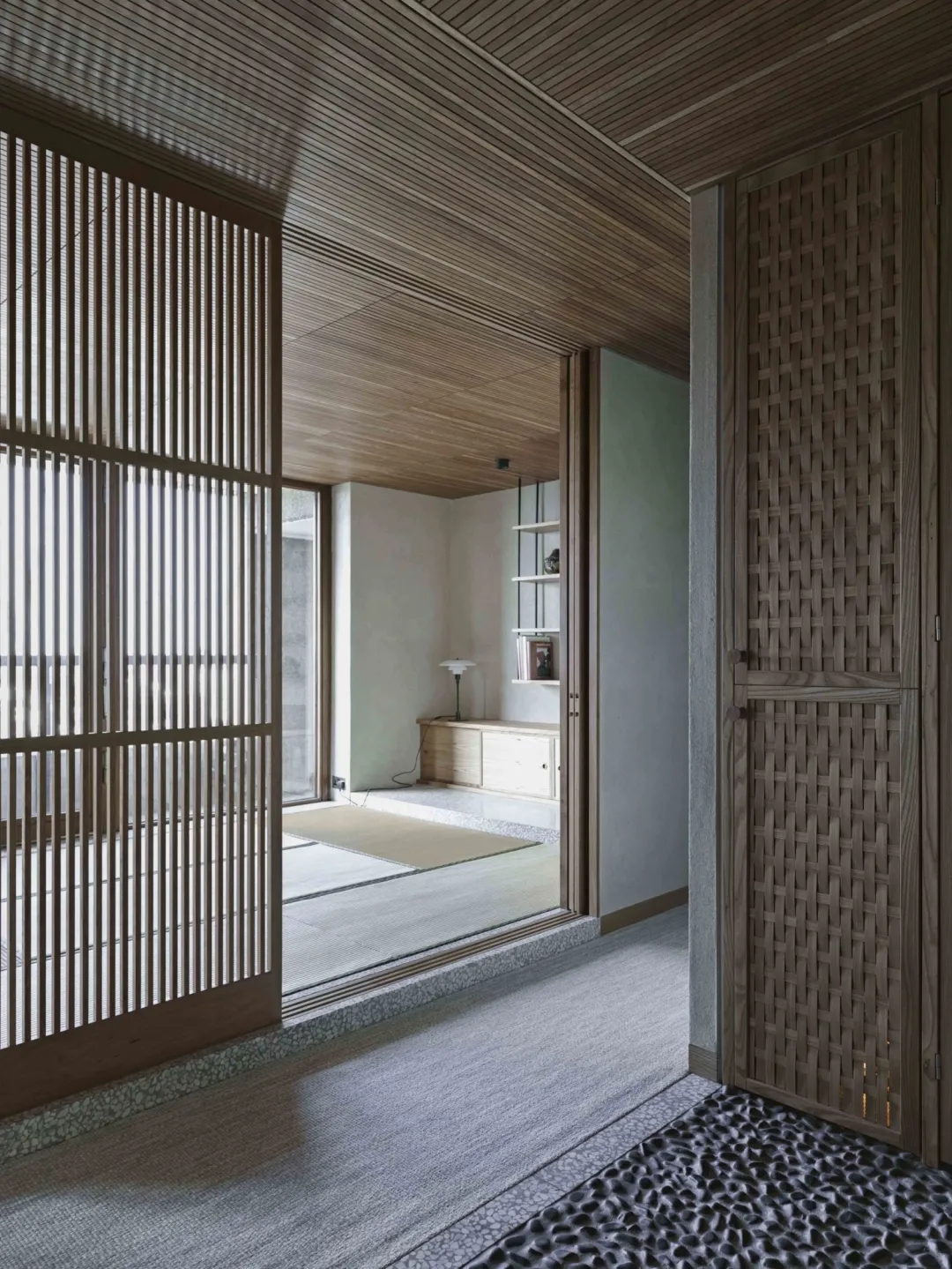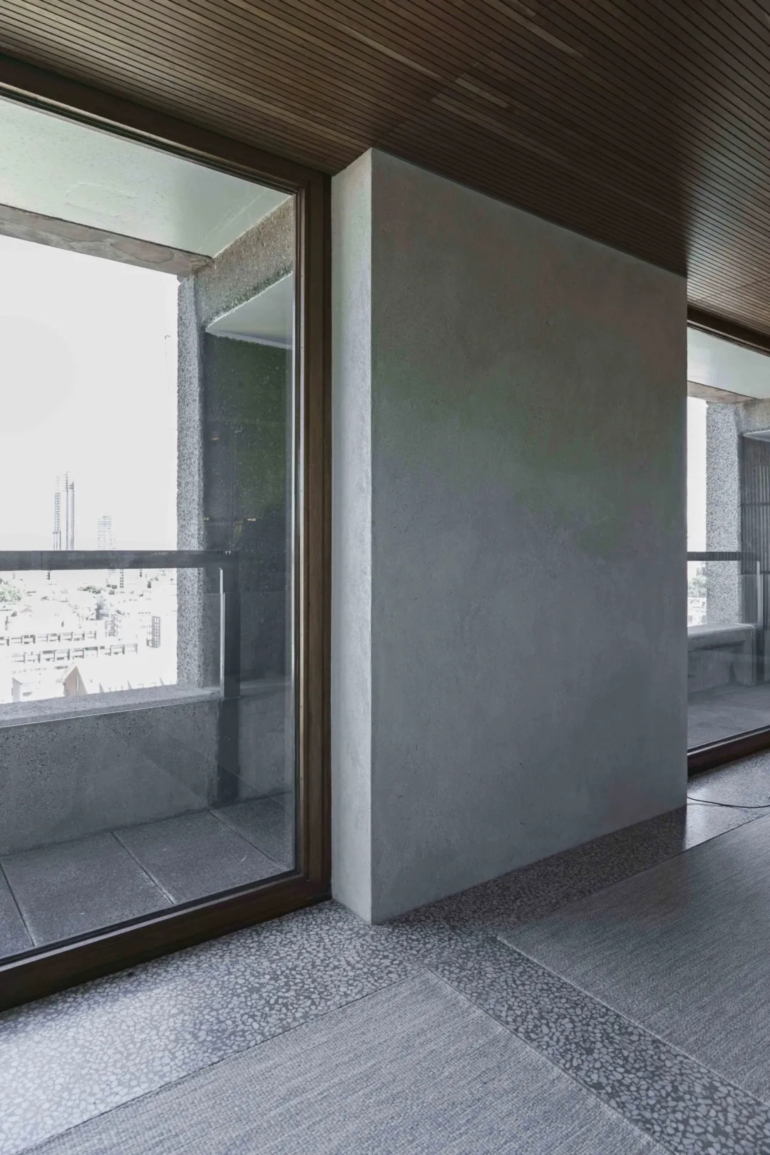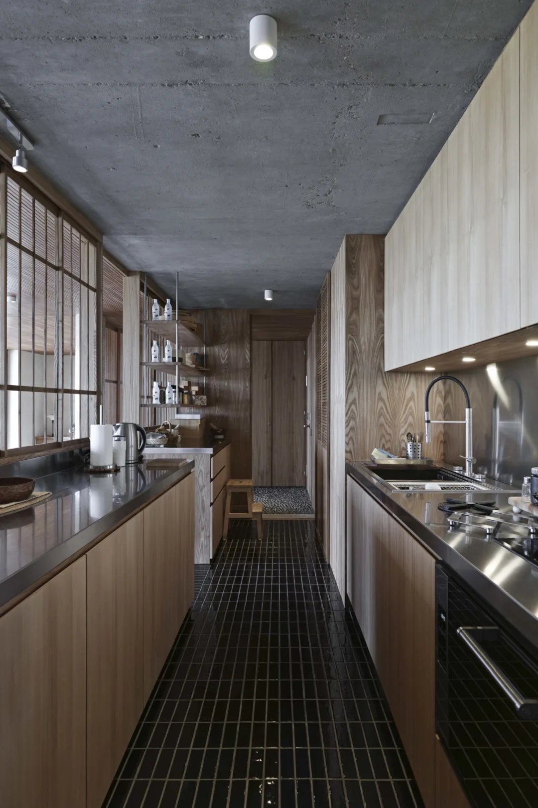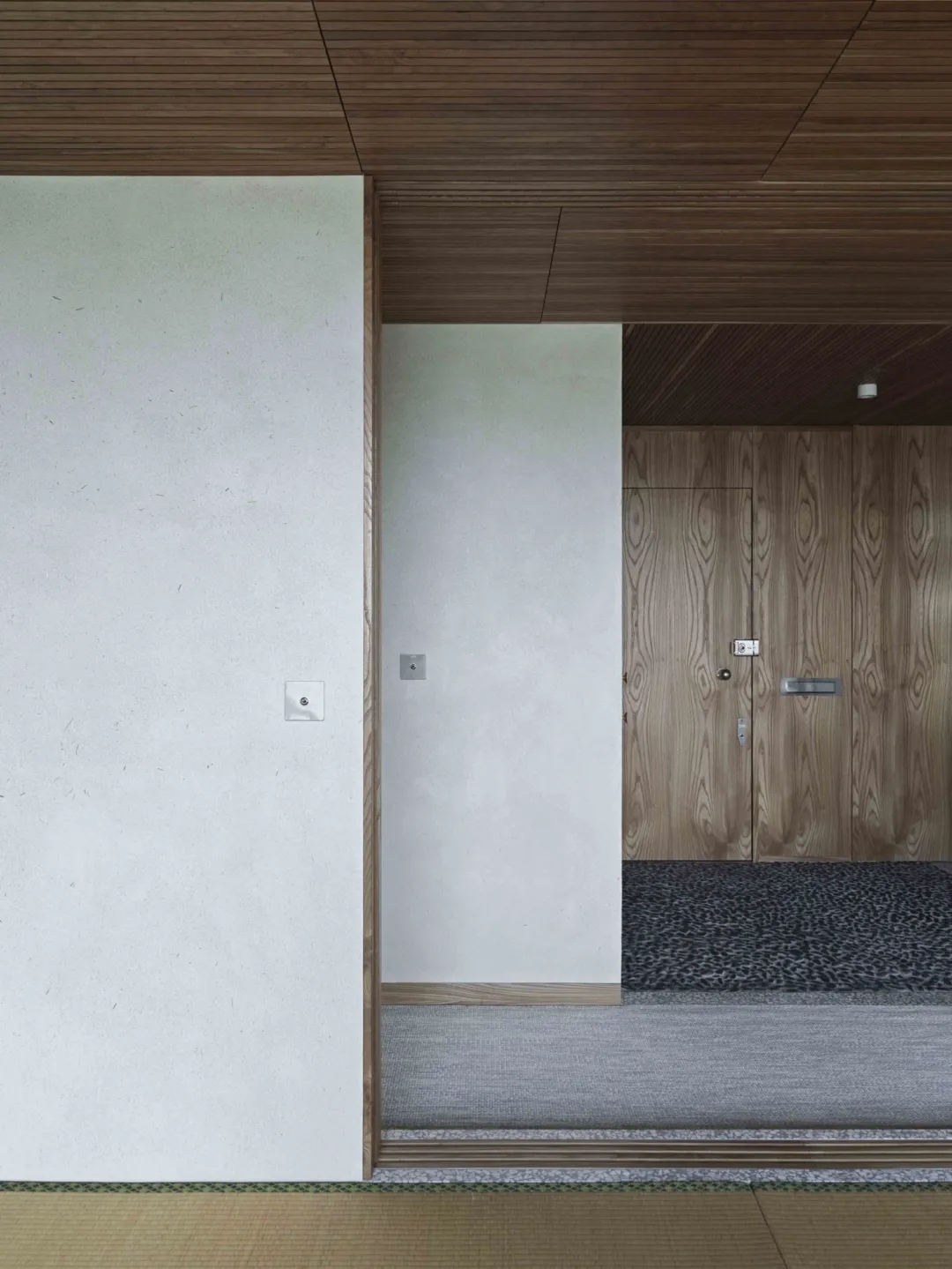 Takero Shimazaki喜欢处理较轻、短暂的木屏风,精确地布置了新井大石石卵石入口地板,榻榻米垫对着混凝土墙的原始和沉重的质量,现有的拱形防火门,作为以及外面伦敦金融城的壮丽全景。