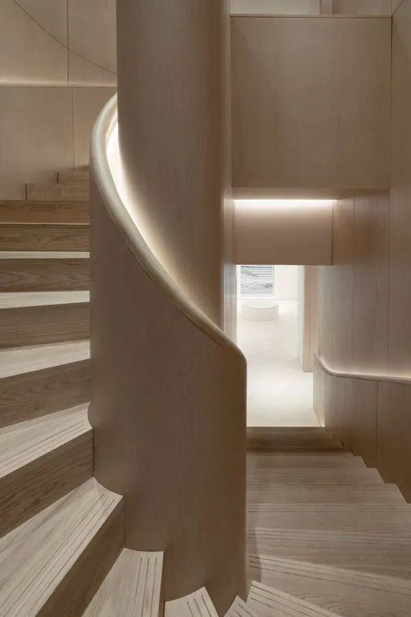 一个旋转的楼梯,采用带有嵌入式照明的非常轻的木材,通向二楼,由于注入了木材,这里的气氛不那么简朴但兼容。