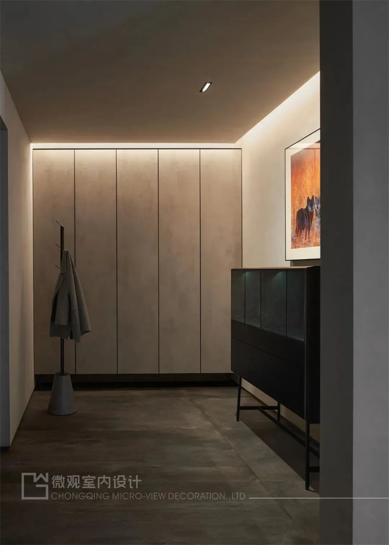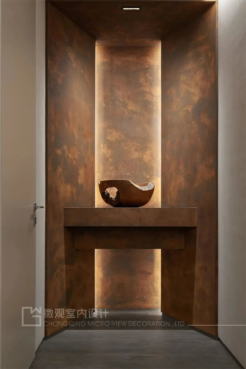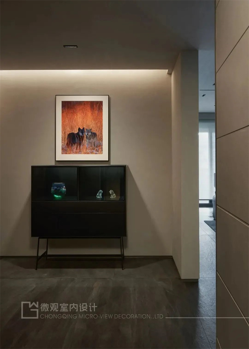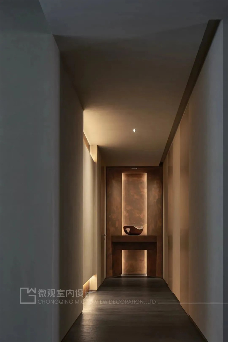 家中的走廊也是一处低调的“风景”,西慕艺术水泥金属质感打造朴实无华的墙壁与艺术藏品和朦胧的灯光交织在一起,虚实相映,将传统东方生活美学提炼于现代住宅中营造出平静、克制的仪式感。