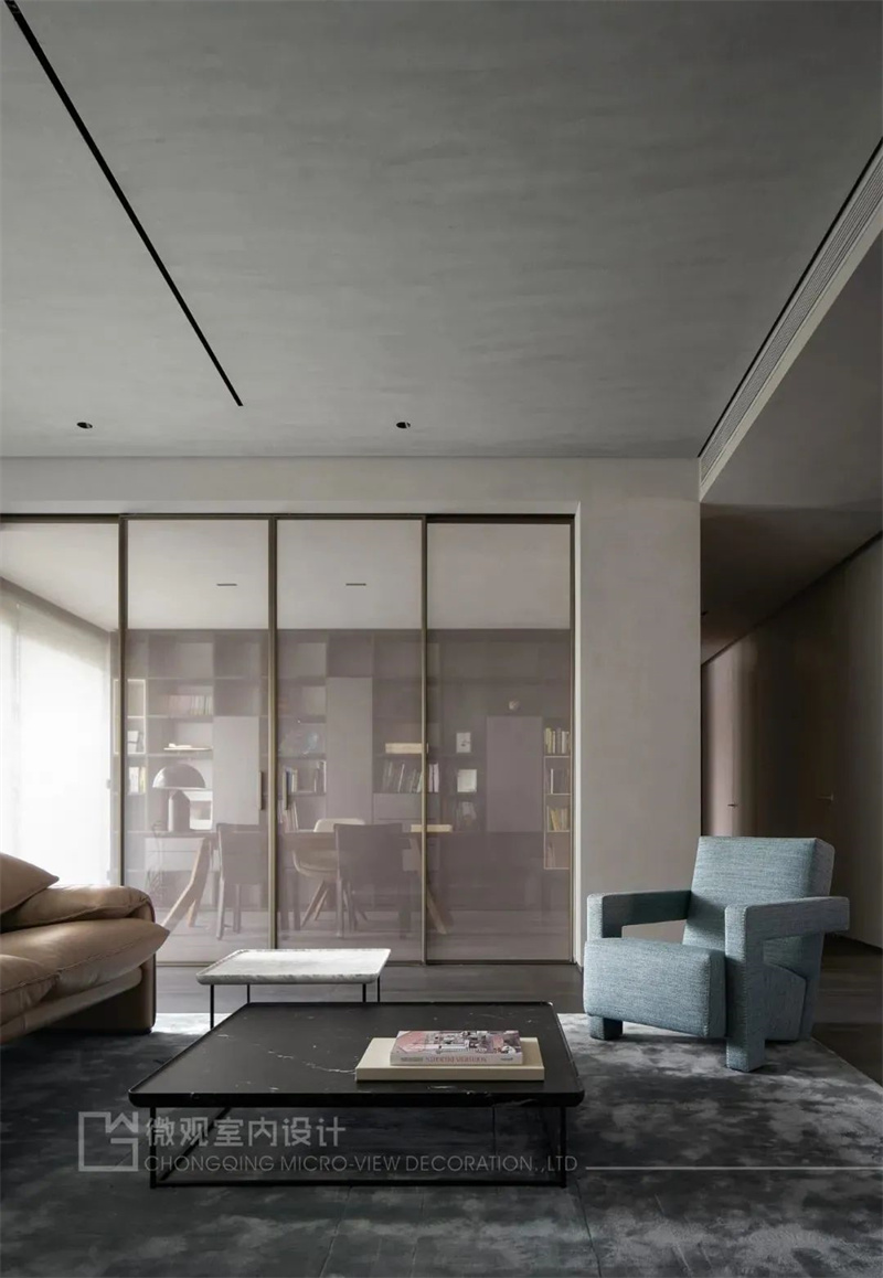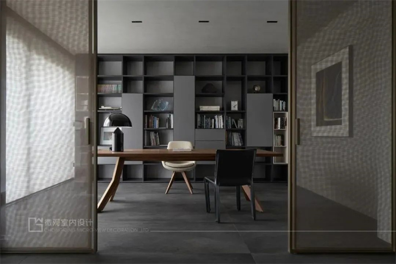 屋主平时在家有长时间办公和阅读的习惯,于是设计师将客厅与书房结合,并利用玻璃推门进行了简单的隔断,打开和关上都可以自由选择,既保证了空间独立性,也不妨碍家人之间交流和互动。