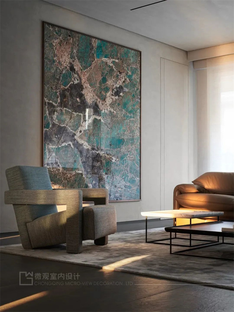 软装设计也延续这种简约的思路,用产自南美洲的天然大理石作为墙面装饰代替传统的挂画,同时为进一步烘托建筑感,家具多采用天然木材,用简洁温润的色彩和造型来柔化略显冷峻的硬装空间。整体空间的材质搭配与西慕艺术水泥相融合,使得更加自然、和谐、统一。
