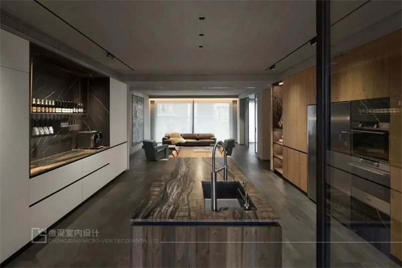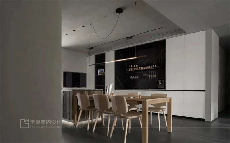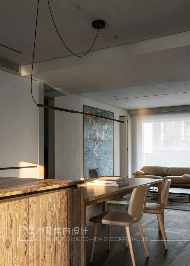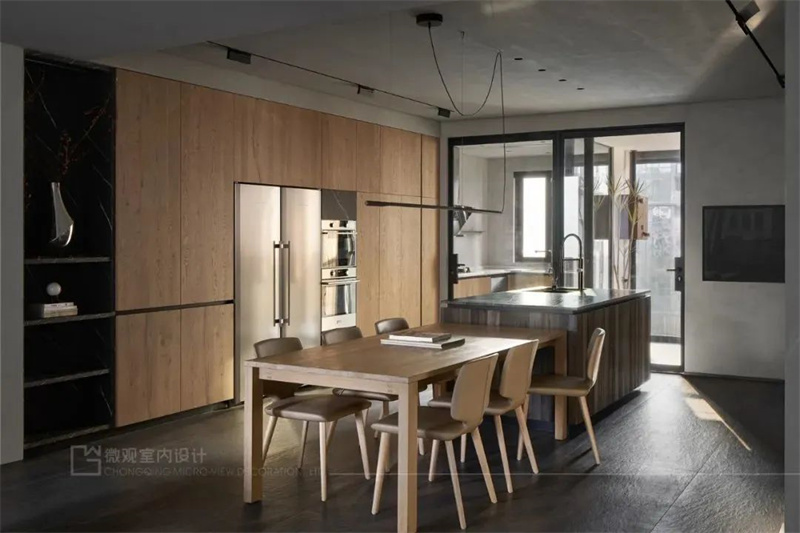 餐厅采用岛台+餐桌的一体定制,配合后面整排的高柜形成一个完整的西厨区域,使餐厅的功能更加完整全面。西慕艺术水泥的顶面与温和的木质、冷峻高级的大理石两种不同材质的完美融合,赋予其刚柔并济的空间氛围。