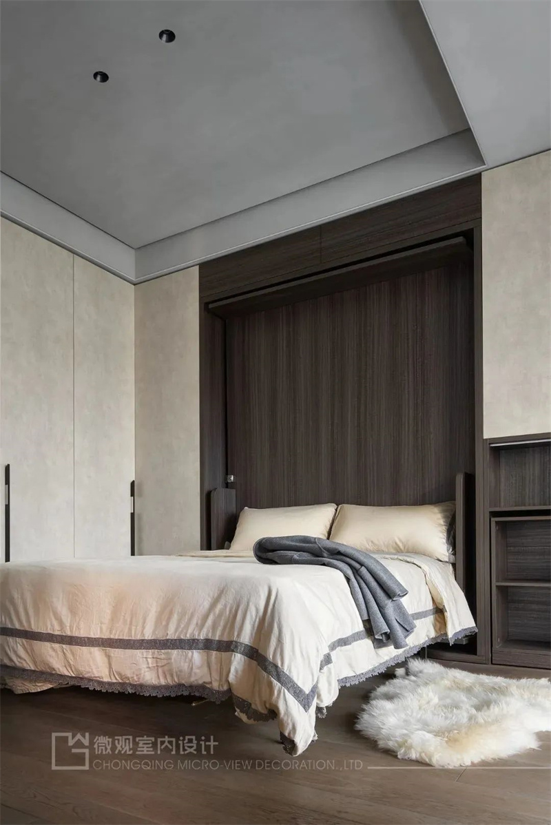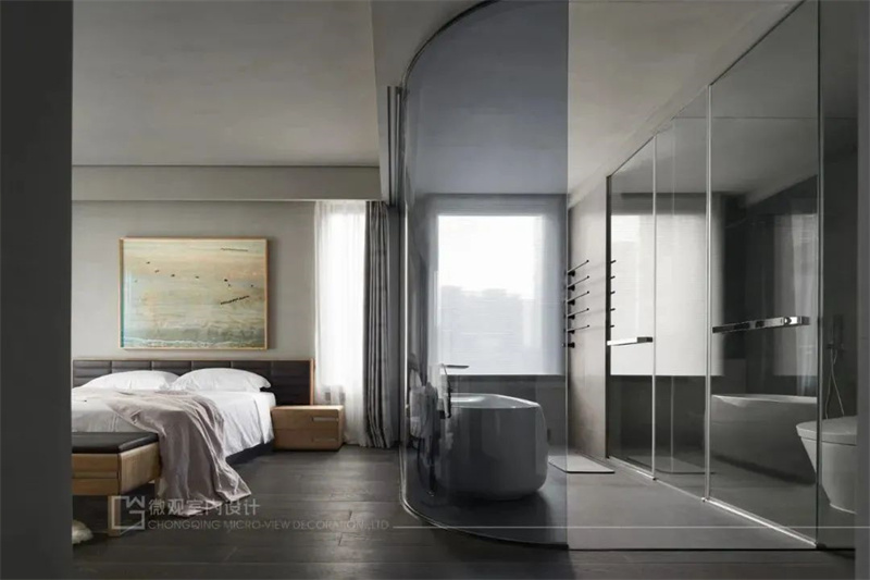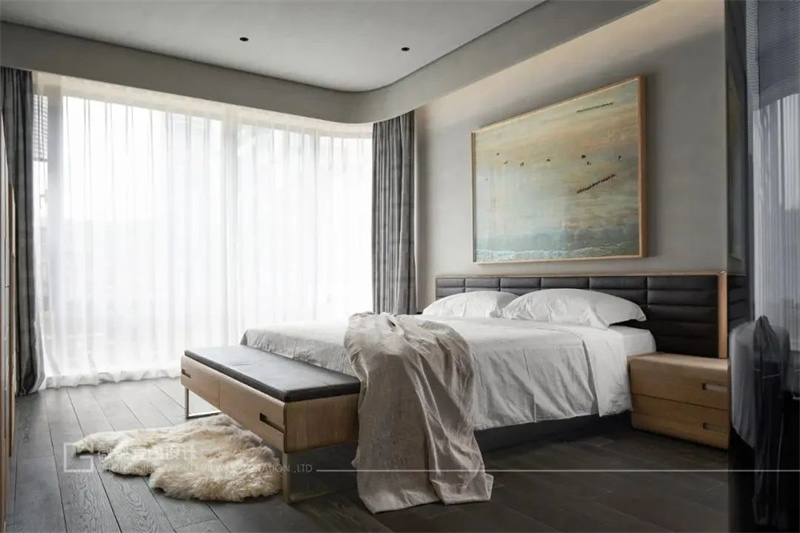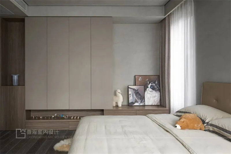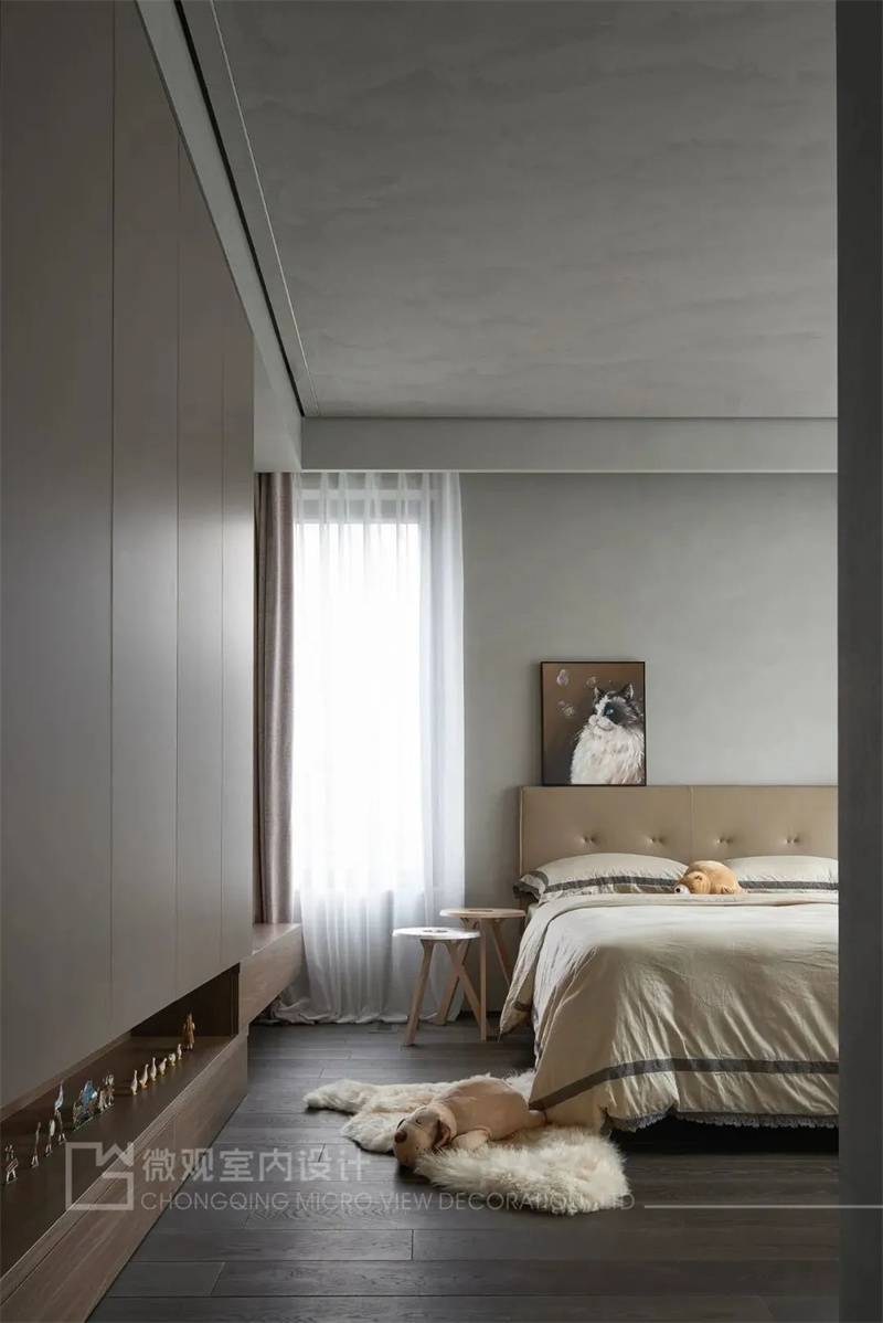 主卧空间采用高级灰色的西慕艺术水泥,使得业主可以从繁琐的日常中走出来,回归安静自然又充满质感的睡眠空间。