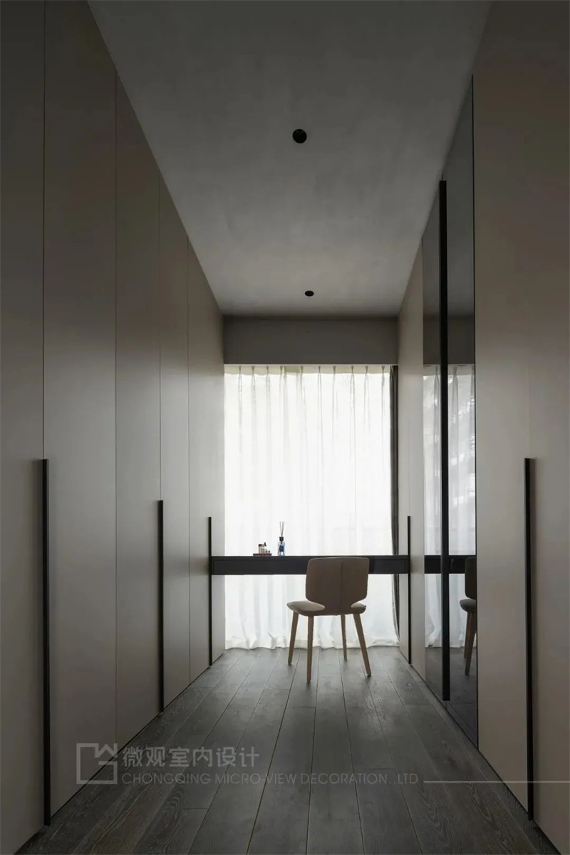 卧室门采用了无把手的隐形门设计,门板上刷的是与客厅墙顶面同样的西慕艺术水泥,使门与客厅墙面融为一体,关上时门就完美地「隐身」了,将隐形做到极致,体现了空间的整体性。