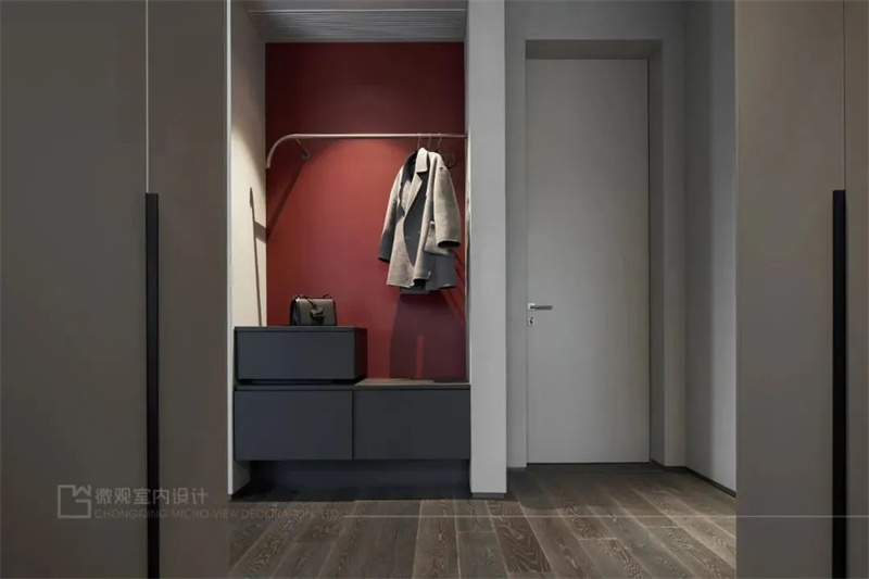 开敞式挂衣区专门考虑了暗红色皮质柜体,提升了整体家居的质感,打造出更加符合业主个性的衣帽空间。
