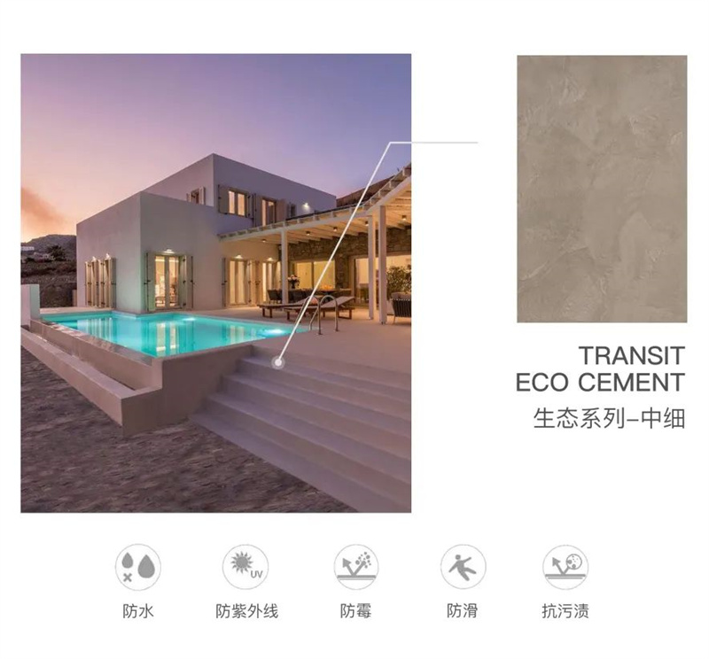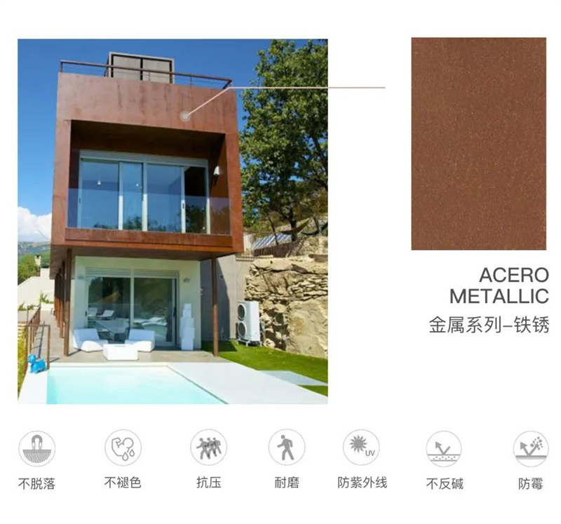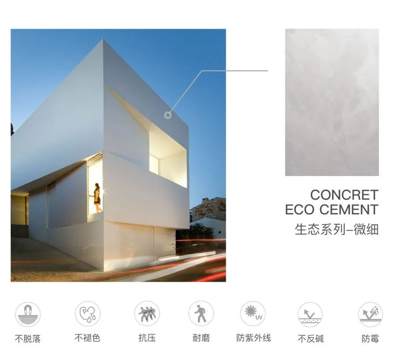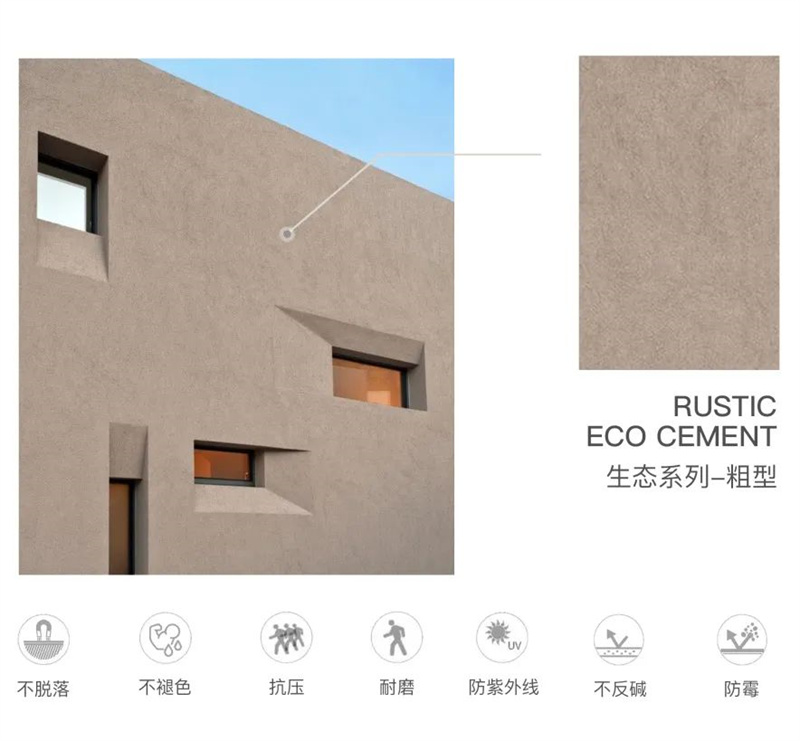 可以直接作用于房屋的外立面,翻新以及涂刷,它具有防水、易清洁的特性,使得它非常适合作为建筑外立面来使用。根据不同设计的风格可以有不同质感的材质来打造整体风格的不同。