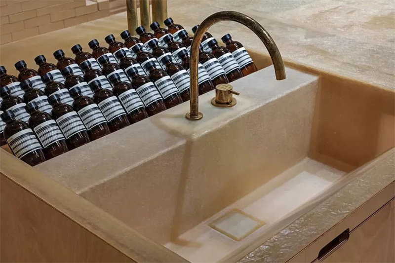设计师考虑了哪种颜色可以形成对比,并以最美丽的方式突出显示Aesop的琥珀色瓶子,然后提出了仅使用这种米色的想法。