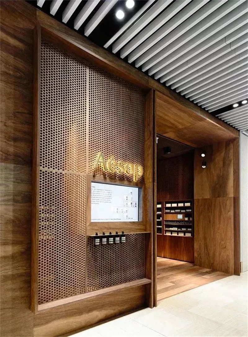 在空间划分上,KTA 以延伸至天花板的木制小孔隔断来制造透气性,呼应产品的天然与纯粹。尽管店面不大,但 Aesop 仍在践行它们的品牌精神,以有温度的空间与产品吸引消费者。