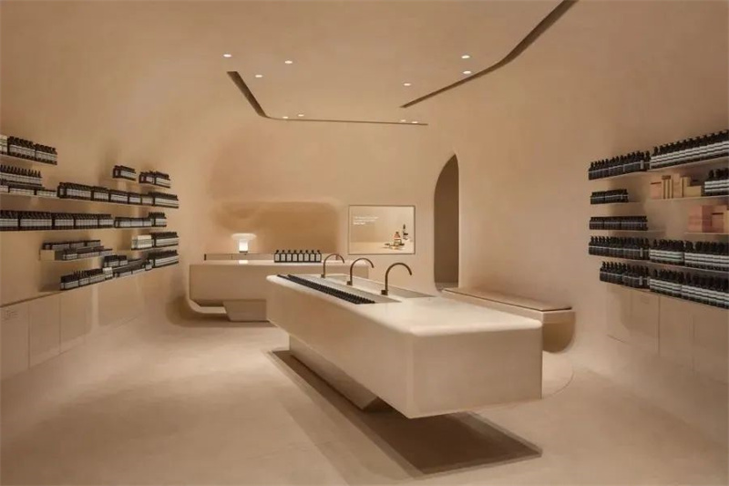 地板上铺着同色系的石英地毯,如果不是椭圆形石灰华销售柜台和壁挂式水槽,这家店几乎是单色的。除了香水、家居用品和旅行必需品外,新的 Aesop 商店还出售该品牌的全系列皮肤、头发和身体产品。