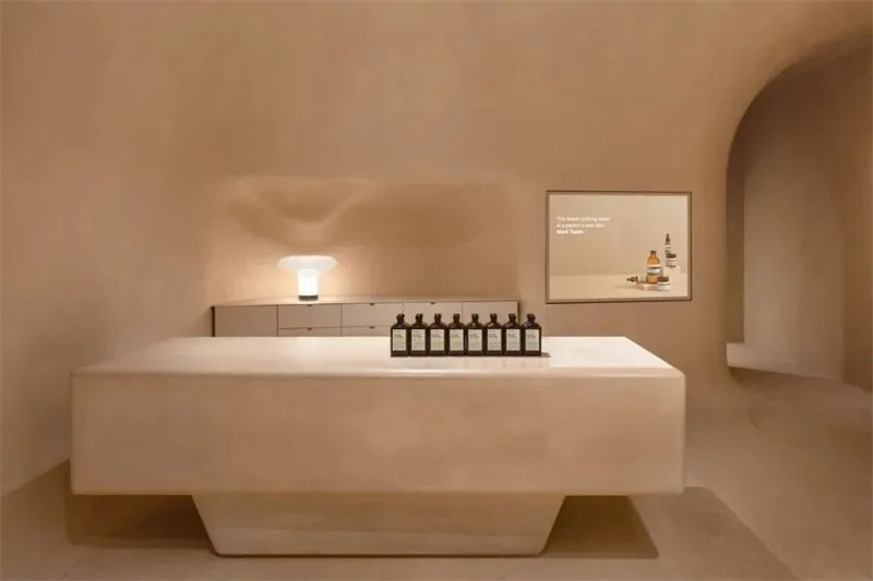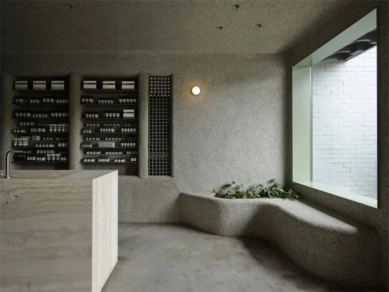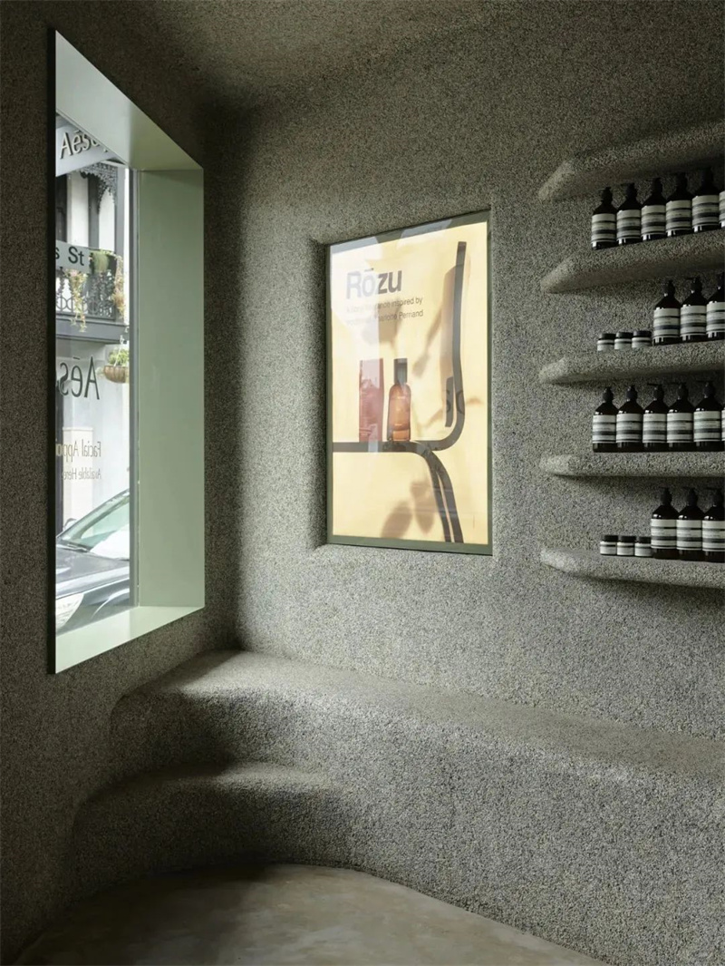 采用西慕黏土品牌Matteo Brioni打造整体空间,黏土的自然与质朴十分匹配伊索的调性,Matteo Brioni 的天然细粒黏土饰面TerraVista Wabi 为 Tolouse 的 Aesop 商店定制的颜色。