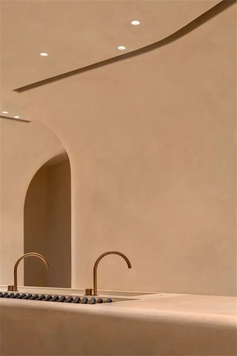此次设计师所选择的美学灵感来自 qubba,一种常见于传统阿拉伯建筑中的圆顶结构,在这里,它被翻译成三个这样的结构,它们在头顶相交,由烧焦的赭色灰泥制成,而在下面,形成鲜明对比的是,可以找到主要的线性设计,由光滑的黄铜搁架捕获。