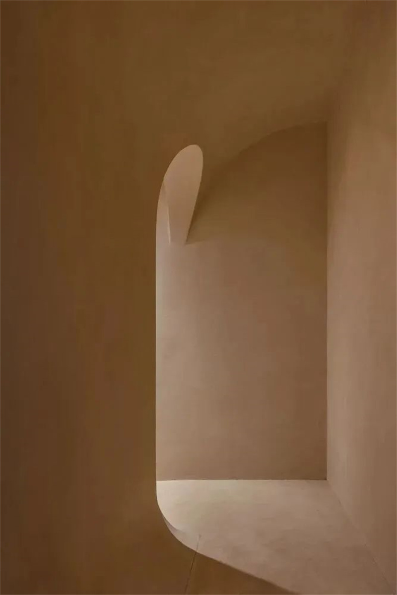 但是, 简单的单色空间可能不太有趣,因此设计师决定使用米色的不同材料来营造空间的深度感,FRP用米色,砖用米色,釉料用米色,木材用米色,米色的沙墙等。一个进入空间并逐渐注意到细微的差异。