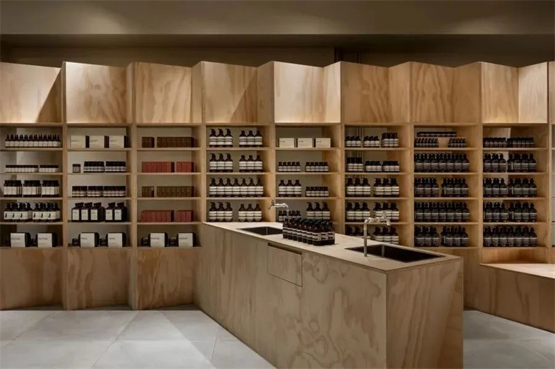 店中大量运用台湾在地绿建材,将 F1 等级的环保木合板组合成几何茧型层架,每个设计细节都以永续为原则,并极尽可能地减少资源浪费,并成为一个未来可重复使用的「空间中的空间」,持续把未来永续的设计方针融入Aesop的思考中。