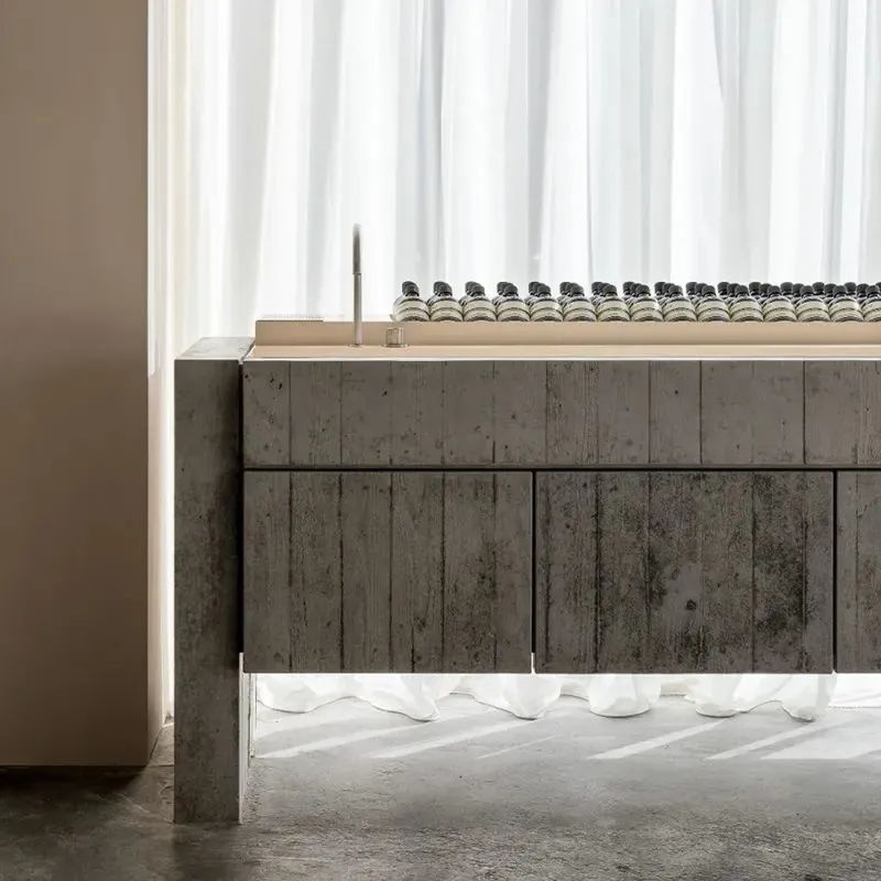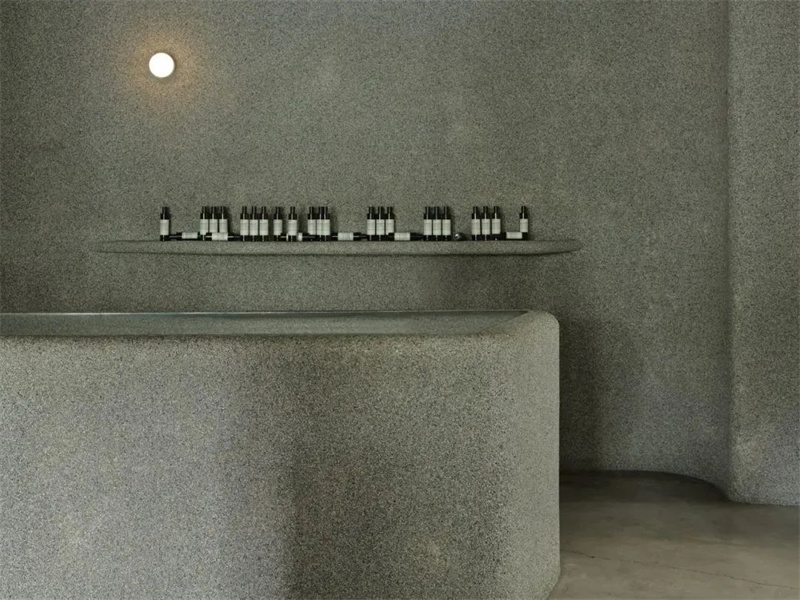 石灰水泥材质的墙面以人工涂抹水泥覆盖,使墙壁和天花板完美融合无接缝。充满戏剧张力的弧形天花板吸引了人们的目光,而位于店铺中央的混凝土的矩形水槽则是整间店铺的视觉重点。