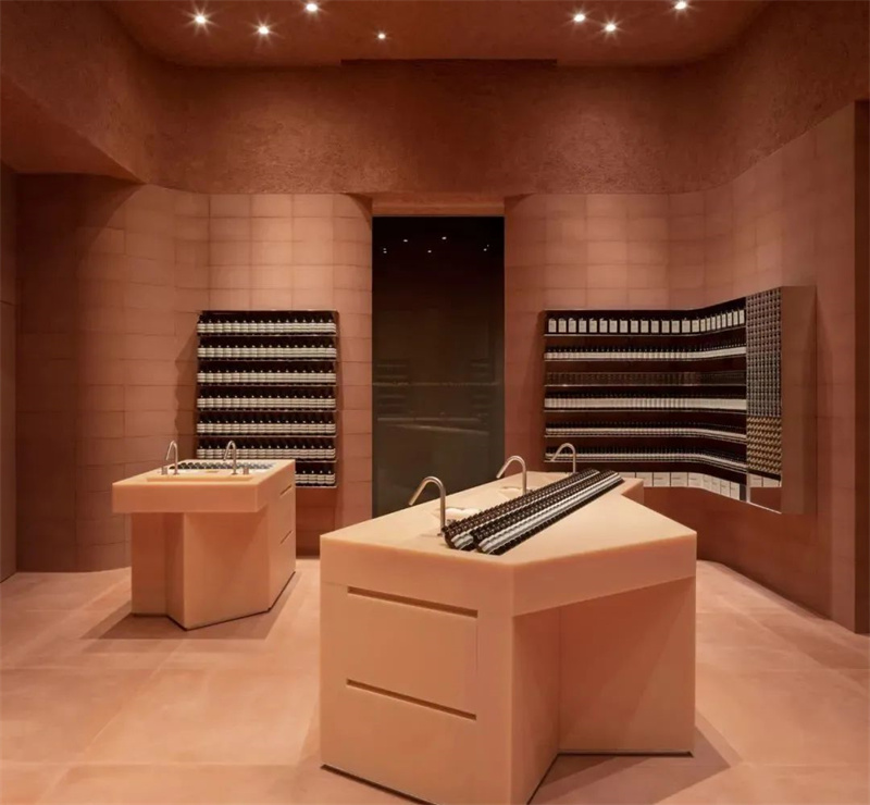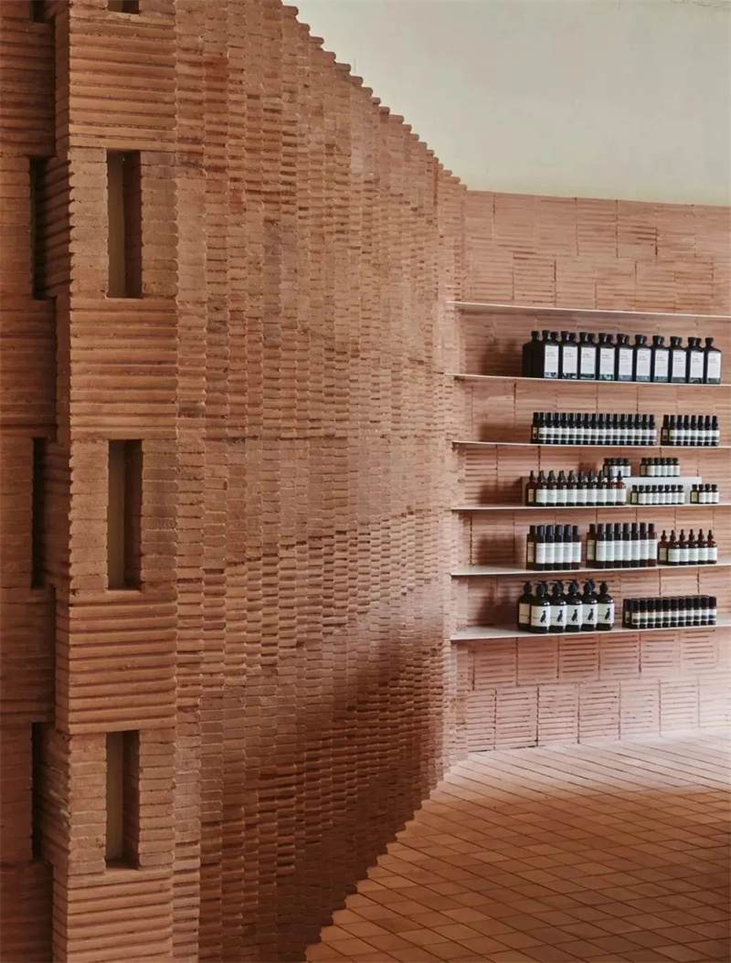 Escobedo的Aesop商店位于布鲁克林的Park Slope社区,来自瓦哈卡的数以百计的玫瑰色夯土砖堆叠在相对的对角线上,形成网格状的墙壁,突出到商店并将空间分成开放的部分,决定了面向公众的商店布局。