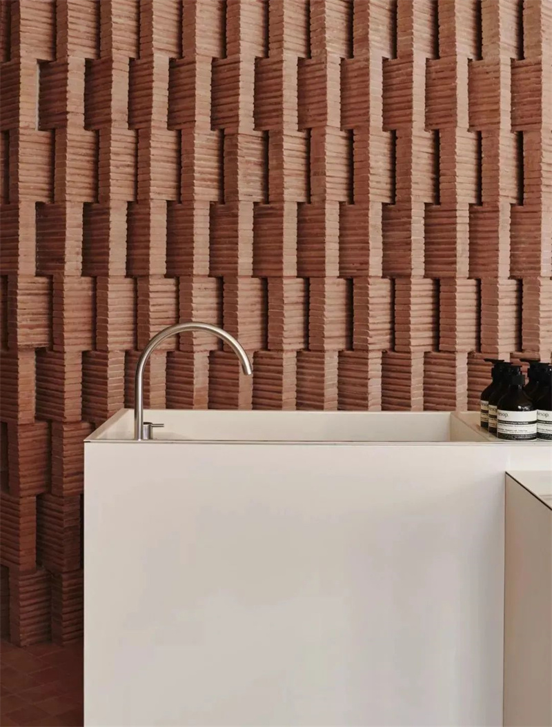设计师专门定制了由红砂岩粉末制作而成的砖,以营造出温暖的赤陶效果,并与水泥砖和英国实验室品牌Clayworks黏土相匹配。