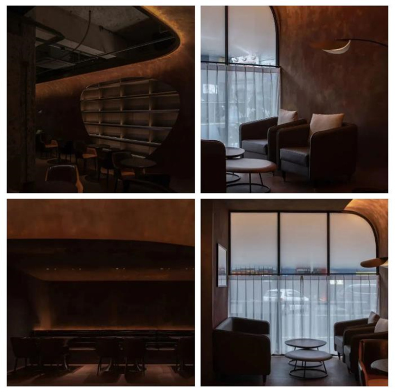 萃坊·CAFE G1广泛应用西慕艺术水泥铁锈墙地一体效果,藤条制作的吧台被铁锈包围着,铁锈水泥传递斑驳沧桑的美感,与工业风设计完美搭配,暖金色的灯光照亮每一个角落,柔和舒适。