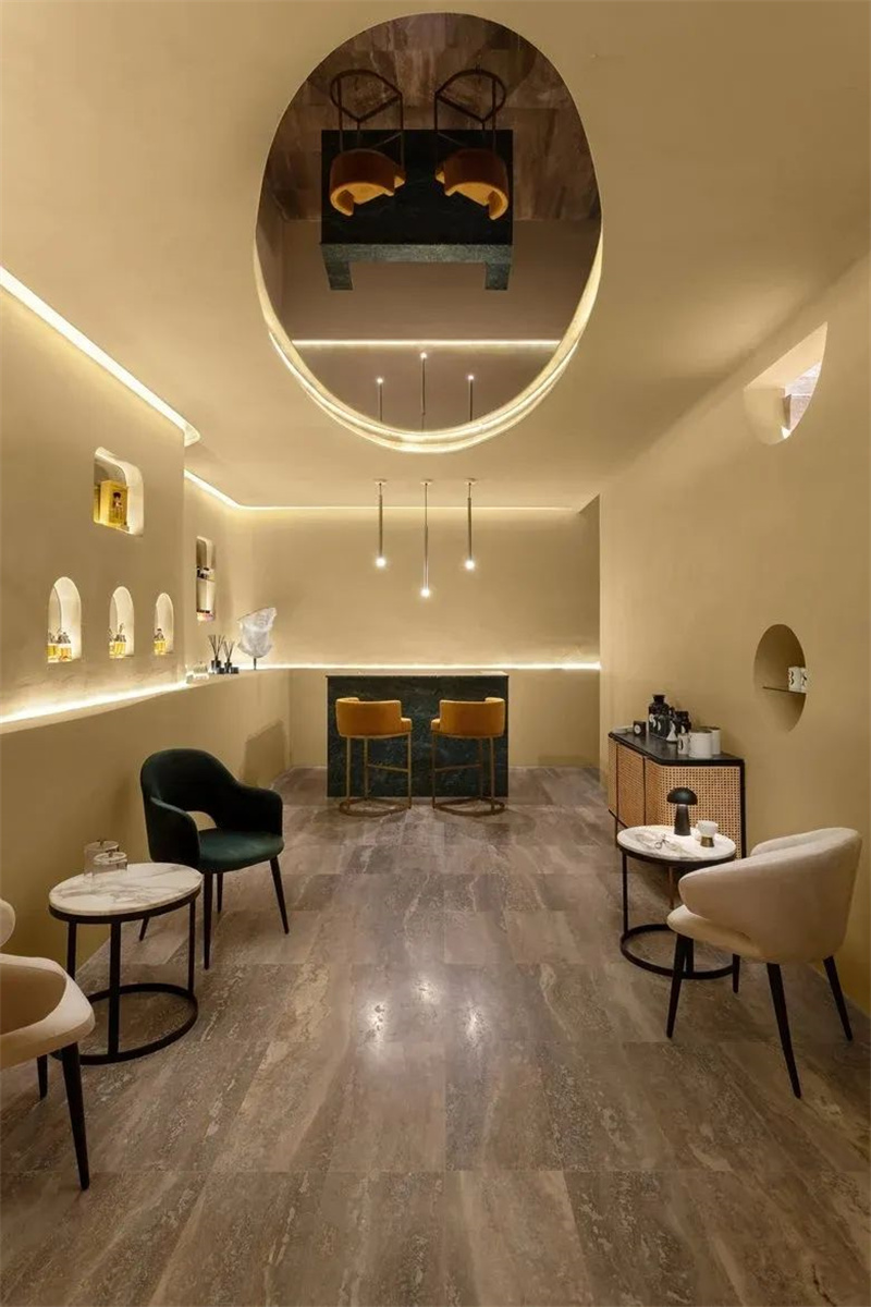 水平表面覆盖着棕色的洞石,这是一种天然的材料,它的脉络和色调与沙漠的风景相呼应。大理石和洞石的不规则石块从地板上浮现出来,具有不同的功能,如展示、容器、收款台。