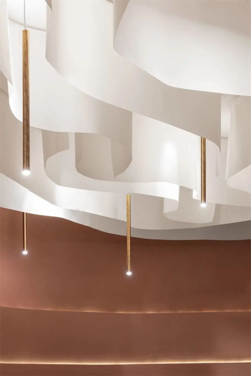 在空间的顶部,柔和的白色窗帘的起伏图案,风的作用显而易见,它塑造了墙壁的材料。专门用于 “香水鸡尾酒 “的房间,被想象成底土中的岩石空洞,其特点是更静态的几何形状,与上层的流动性相反,营造两种体验之旅。