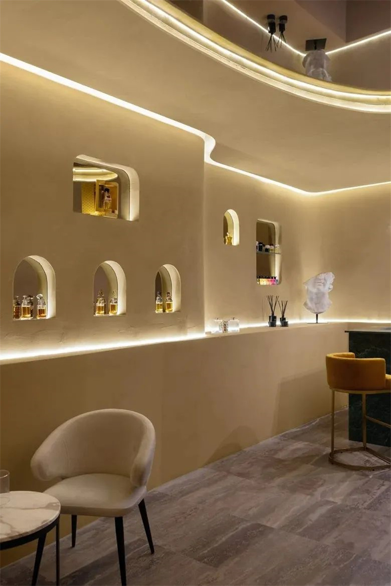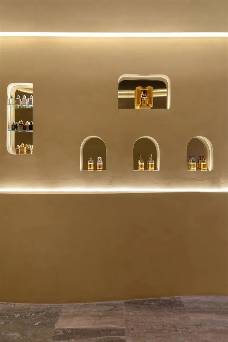 设计一家香水专卖店不可避免地意味着要处理千年的中东传统,即准备油、香精和香水,使材料、形状和颜色回归自然。这些元素构成了一个表达词汇,用于绘制一个基本的、令人回味的空间,它涉及视觉和嗅觉的共鸣关系。
