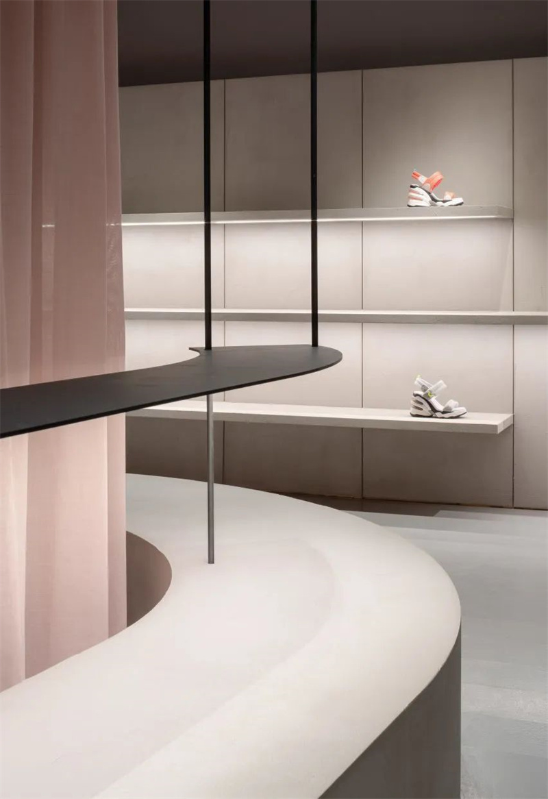 位于帕尔马的 ASH Mallorca 商店以弯曲的混凝土表面和悬挂的黑色货架为特色,以柔和的粉红色窗帘为背景。95平方米的空间里几乎没有其他元素,确保鞋子能够脱颖而出。