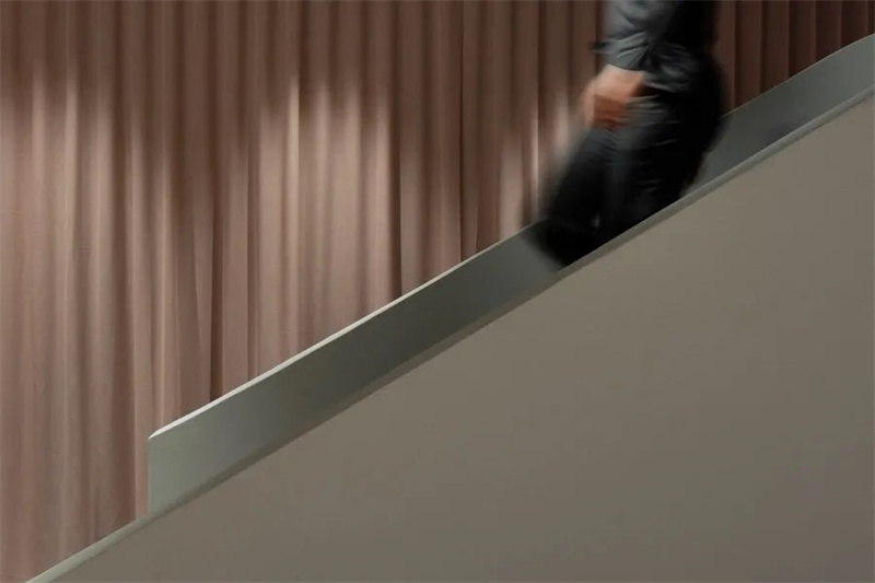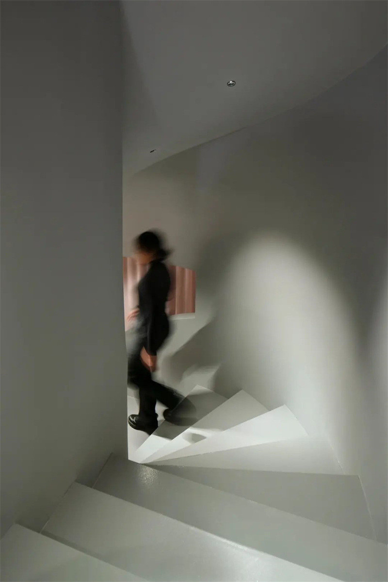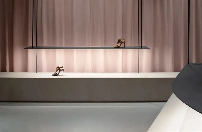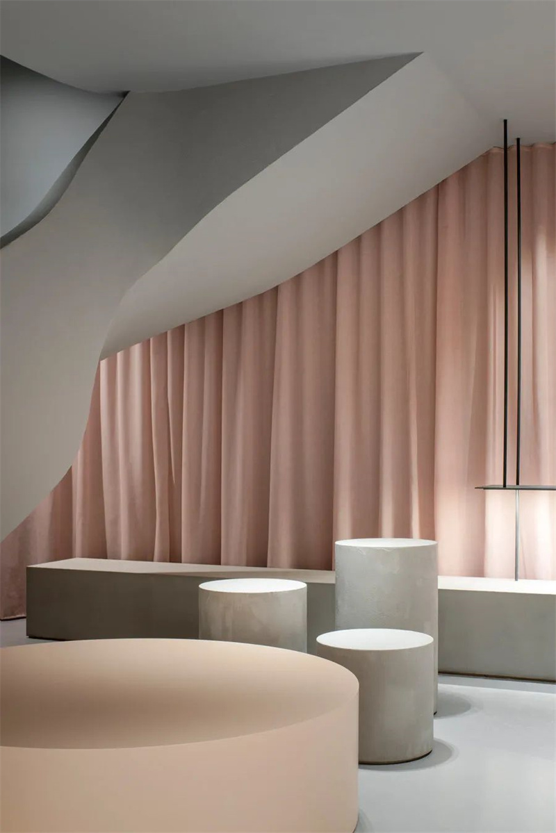 两层楼的储藏室和收银台都隐藏在粉色窗帘后面,“一层浅粉色的纺织层在商店的主体上展开,并在情感上将底层与地下室连接起来。”柔软的织物缓解了混凝土所带来的冷硬感,而优美的曲线则进一步突出了个性鲜明而大胆的鞋品。