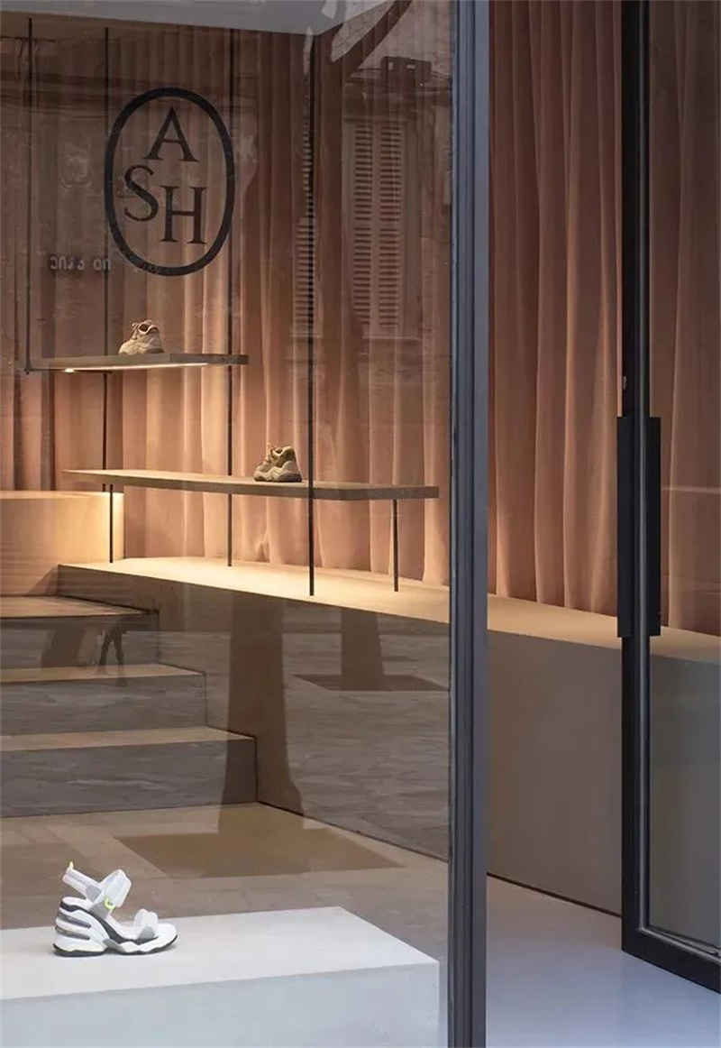 “有意识和朴素的材料选择定义了空间的形状和配置,混凝土的硬度让位于织物的柔软度,曲线的美德与大胆的鞋履提案相竞争,极具个性。”ASH Mallorca 商店分为两层。在一楼,中央人行道两侧由凸起的混凝土平台构成。