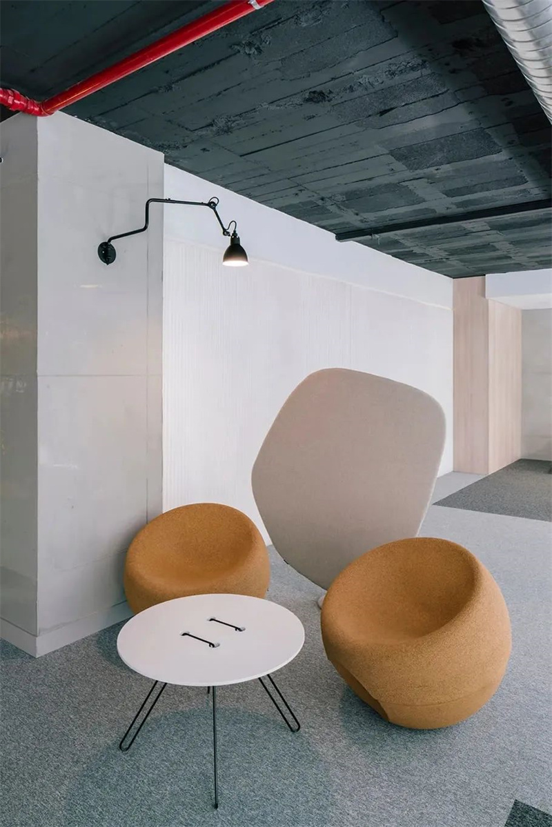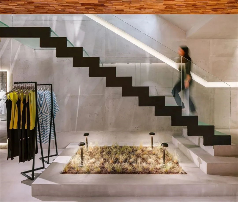 这些材料都是构成空间的核心元素,在突出空间主体的同时也丰富的整个设计的灵魂,位于楼上的办公室通过贯穿两个楼层的三棵树与楼下的店面遥相呼应。