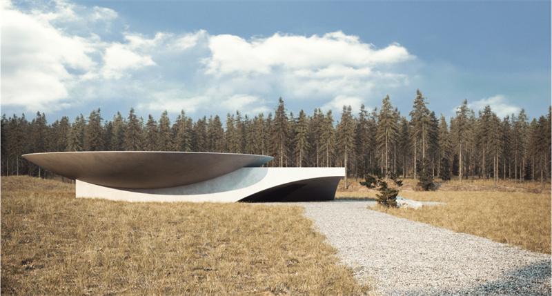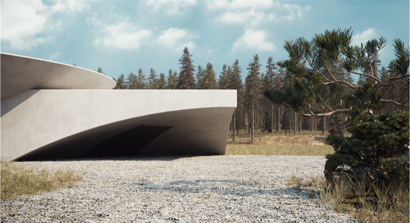 地下房屋计划B的地上部分将包括两个由混凝土制成的相交体积–一种特别选择的材料,其具有“说出可靠性,但又具有美学吸引力”的能力。其中一个体积的形状像倒置的圆锥形,而平顶则用作停机坪。另一个容积将是直线的,被部分切除以形成弯曲的入口。