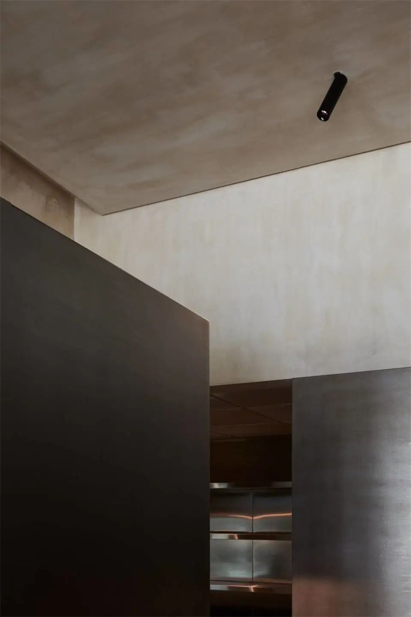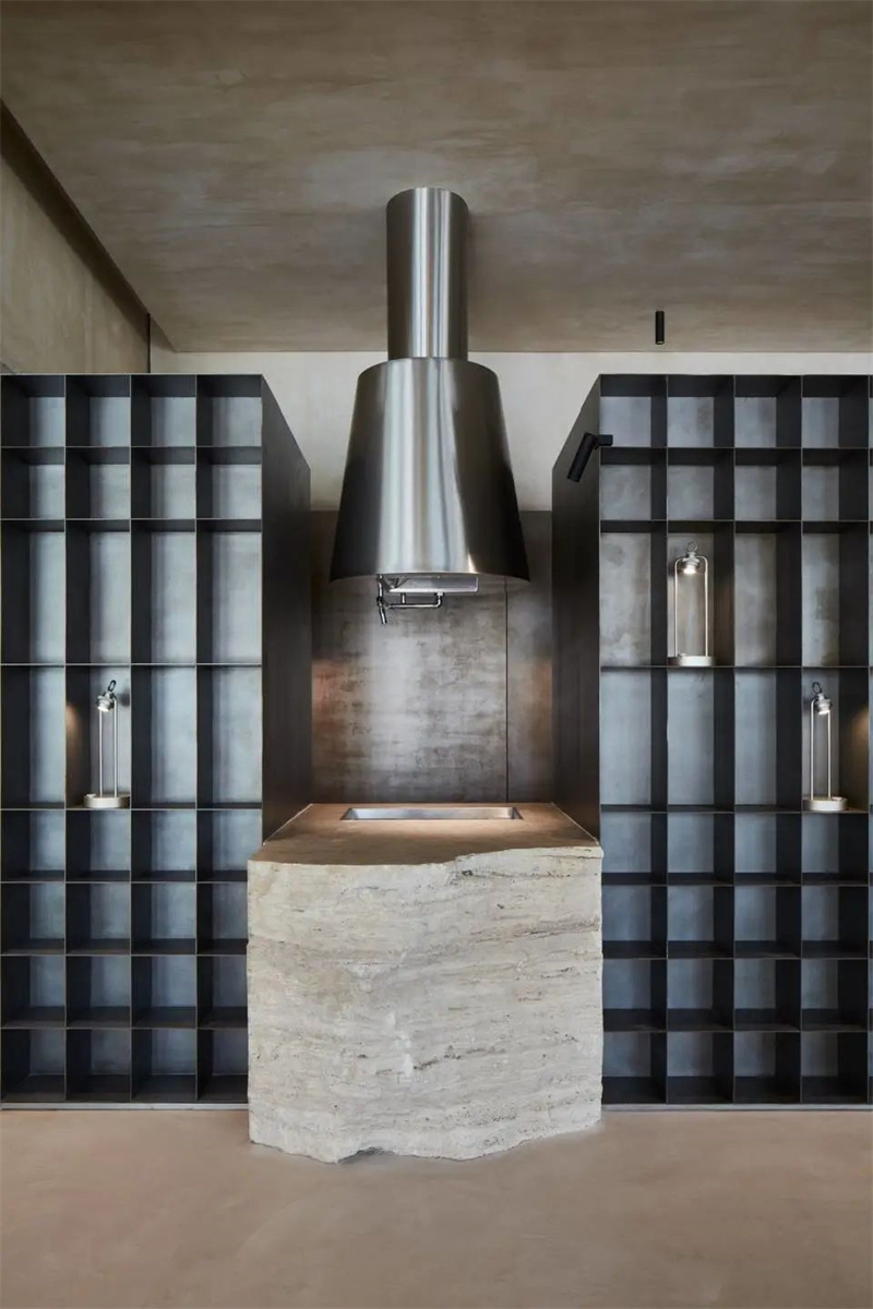 抬高的地板被处理成加厚的板块,用天然粘土完成,并从中雕刻出了座位空间,Matteo Brioni的粘土饰面石膏和矿物地板涂料直接应用于Erth餐厅中。厨房是用酸洗的钢和天然切割的石灰华制成的,进一步加强了构成空间的原始方法。
