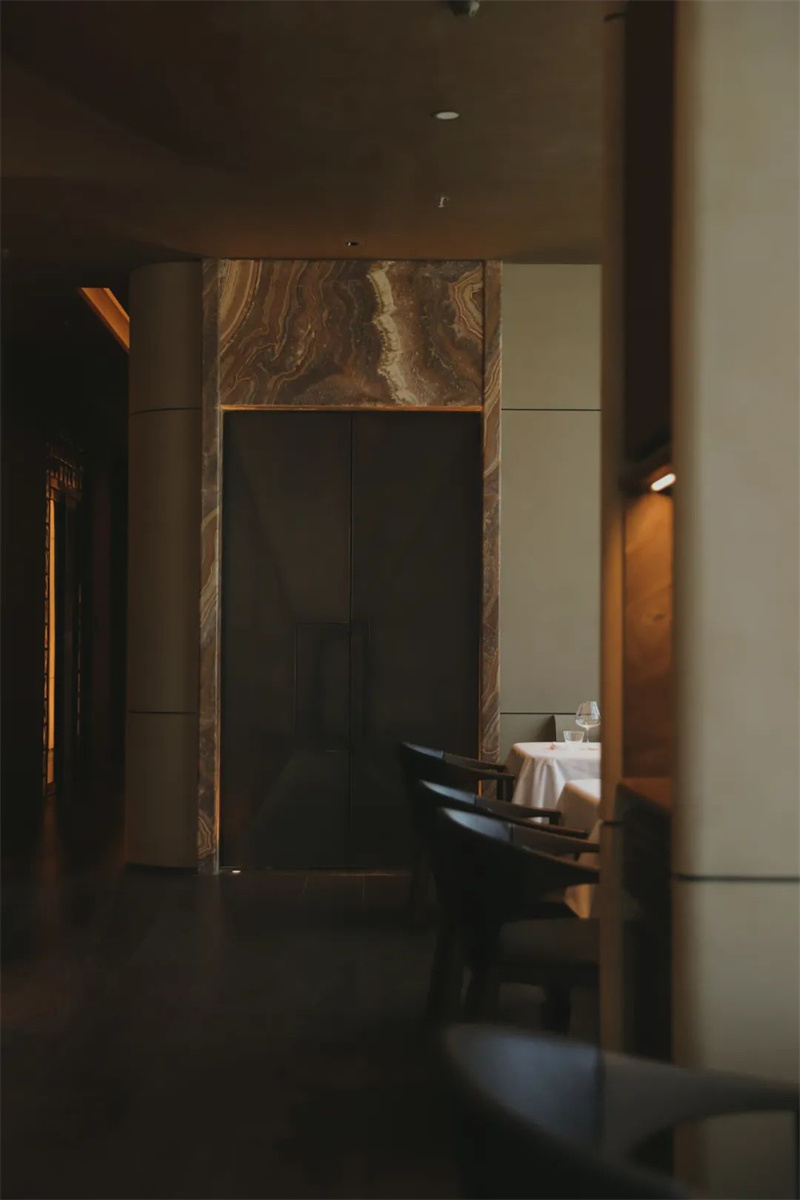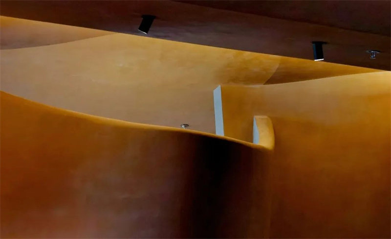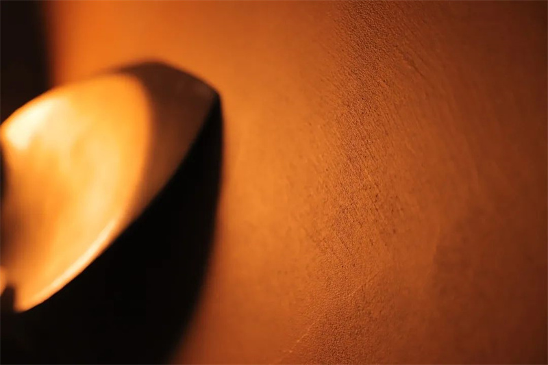 入口处的天花,墙壁和地面均选用极深的咖色西慕艺术水泥ECO CEMENT覆盖,特别是墙和顶,由西慕创意团队采用特殊工艺定制的纹理,在灯光的照射下微微透出细腻的光泽,仿佛是渔民出海时,笼罩着大海的那抹月色。
