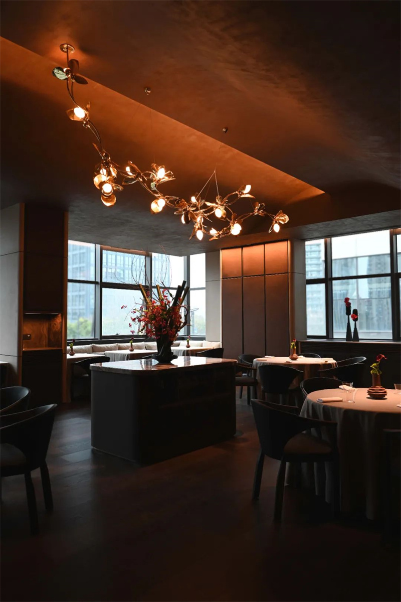 低调哑光的暗色质感衬托了艺术作品奢华的金属质感,而枝形吊灯的每一片“树叶”又在反映着西慕艺术水泥的细密纹理。