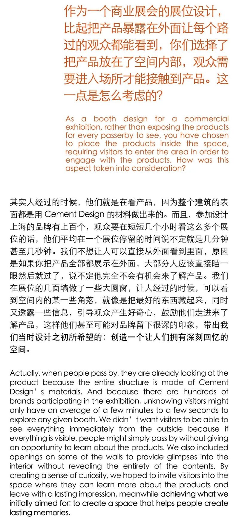 After the exhibition, we had the opportunity to interview Scott, one of the founders of Spatial Praxes. We had a chat about their journey in establishing the team and delved into the deeper design considerations behind the Cement Design booth.